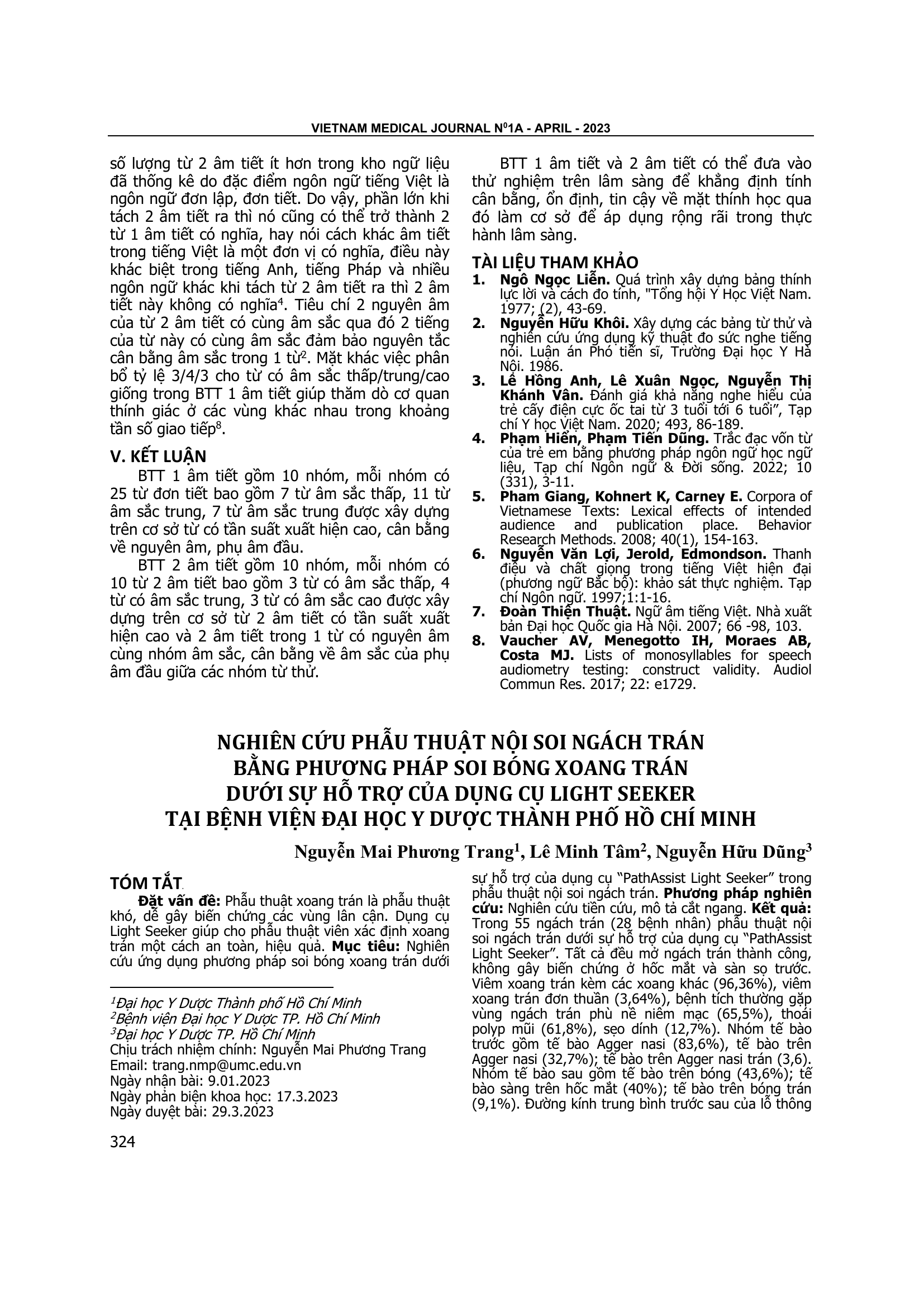 Phẫu thuật xoang trán là phẫu thuật khó, dễ gây biến chứng các vùng lân cận. Dụng cụ Light Seeker giúp cho phẫu thuật viên xác định xoang trán một cách an toàn, hiệu quả. Mục tiêu: Nghiên cứu ứng dụng phương pháp soi bóng xoang trán dưới sự hỗ trợ của dụng cụ “PathAssist Light Seeker” trong phẫu thuật nội soi ngách trán. Phương pháp nghiên cứu: Nghiên cứu tiền cứu, mô tả cắt ngang. Kết quả: Trong 55 ngách trán (28 bệnh nhân) phẫu thuật nội soi ngách trán dưới sự hỗ trợ của dụng cụ “PathAssist Light Seeker”. Tất cả đều mở ngách trán thành công, không gây biến chứng ở hốc mắt và sàn sọ trước. Viêm xoang trán kèm các xoang khác (96,36%), viêm xoang trán đơn thuần (3,64%), bệnh tích thường gặp vùng ngách trán phù nề niêm mạc (65,5%), thoái polyp mũi (61,8%), sẹo dính (12,7%). Nhóm tế bào trước gồm tế bào Agger nasi (83,6%), tế bào trên Agger nasi (32,7%); tế bào trên Agger nasi trán (3,6). Nhóm tế bào sau gồm tế bào trên bóng (43,6%); tế bào sàng trên hốc mắt (40%); tế bào trên bóng trán (9,1%). Đường kính trung bình trước sau của lỗ thông xoang trán 7,35±2,01 mm. Kết luận: “PathAssist Light Seeker” giúp phẫu thuật viên định vị được vị trí đang can thiệp, tự tin hơn trong việc xác định và mở rộng lỗ thông xoang trán. Tuy nhiên, “PathAssist Light Seeker” không thể thay thế được kiến thức về giải phẫu, CT scan và kỹ năng phẫu thuật của phẫu thuật viên.