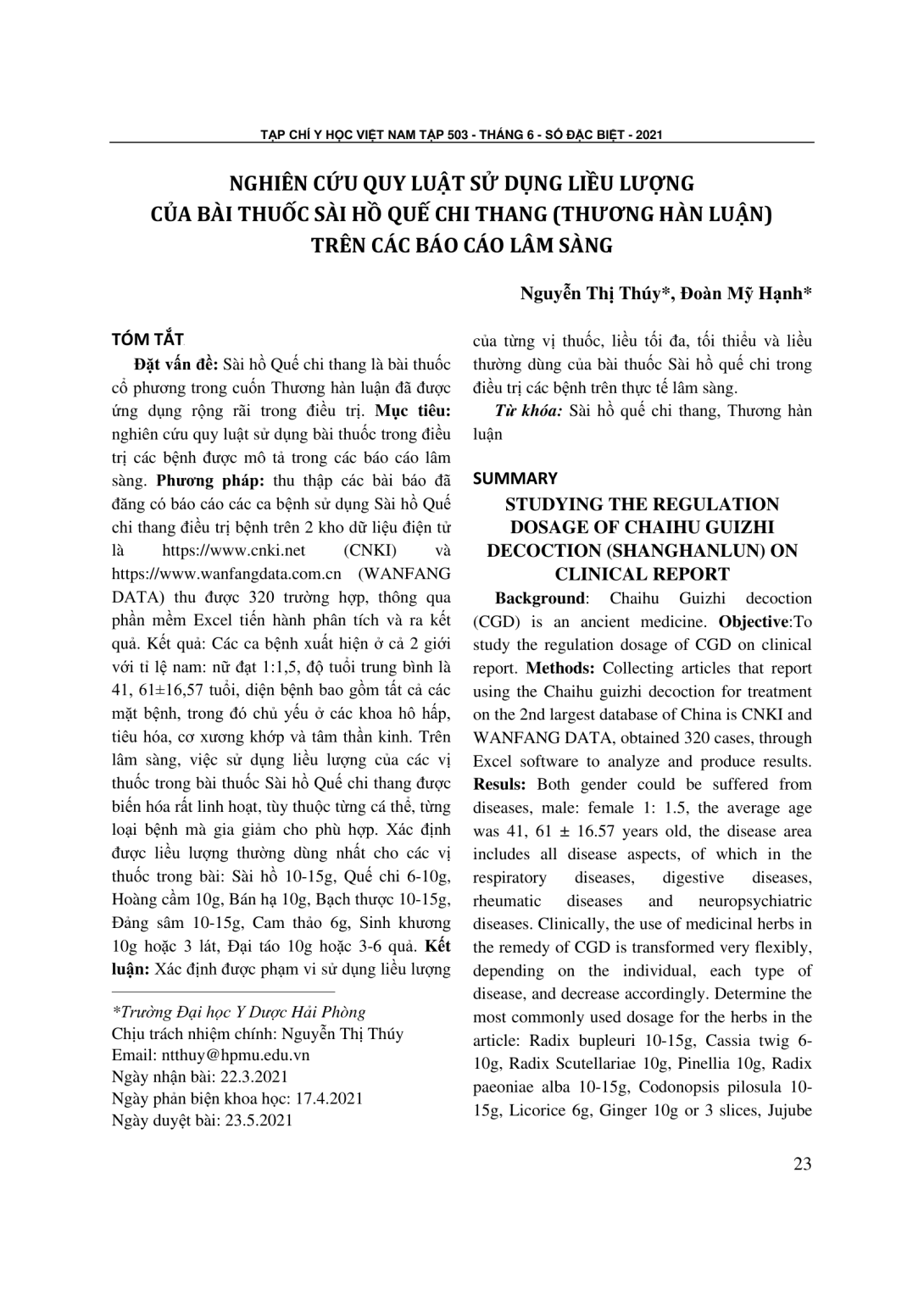 Sài hồ Quế chi thang là bài thuốc cổ phương trong cuốn Thương hàn luận đã được ứng dụng rộng rãi trong điều trị. Mục tiêu: nghiên cứu quy luật sử dụng bài thuốc trong điều trị các bệnh được mô tả trong các báo cáo lâm sàng. Phương pháp: thu thập các bài báo đã đăng có báo cáo các ca bệnh sử dụng Sài hồ Quế chi thang điều trị bệnh trên 2 kho dữ liệu điện tử là https://www.cnki.net (CNKI) và https://www.wanfangdata.com.cn (WANFANG DATA) thu được 320 trường hợp, thông qua phần mềm Excel tiến hành phân tích và ra kết quả. Kết quả: Các ca bệnh xuất hiện ở cả 2 giới với tỉ lệ nam: nữ đạt 1:1,5, độ tuổi trung bình là 41, 61±16,57 tuổi, diện bệnh bao gồm tất cả các mặt bệnh, trong đó chủ yếu ở các khoa hô hấp, tiêu hóa, cơ xương khớp và tâm thần kinh. Trên lâm sàng, việc sử dụng liều lượng của các vị thuốc trong bài thuốc Sài hồ Quế chi thang được biến hóa rất linh hoạt, tùy thuộc từng cá thể, từng loại bệnh mà gia giảm cho phù hợp. Xác định được liều lượng thường dùng nhất cho các vị thuốc trong bài: Sài hồ 10-15g, Quế chi 6-10g, Hoàng cầm 10g, Bán hạ 10g, Bạch thược 10-15g, Đảng sâm 10-15g, Cam thảo 6g, Sinh khương 10g hoặc 3 lát, Đại táo 10g hoặc 3-6 quả. Kết luận: Xác định được phạm vi sử dụng liều lượng *Trường Đại học Y Dược Hải Phòng Chịu trách nhiệm chính: Nguyễn Thị Thúy Email: ntthuy@hpmu.edu.vn Ngày nhận bài: 22.3.2021 Ngày phản biện khoa học: 17.4.2021 Ngày duyệt bài: 23.5.2021 của từng vị thuốc, liều tối đa, tối thiểu và liều thường dùng của bài thuốc Sài hồ quế chi trong điều trị các bệnh trên thực tế lâm sàng.