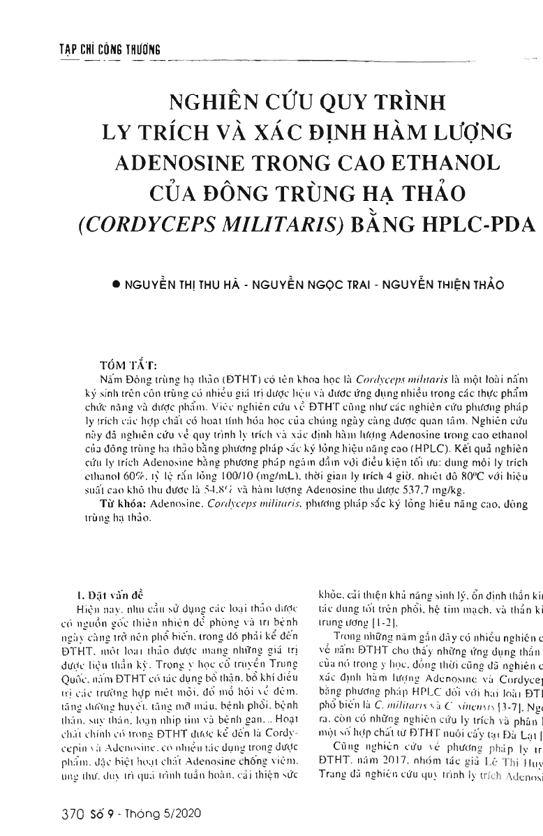 Nấm đông trùng hạ thảo (ĐTHT) có tên khoa học là Cordyceps militaris là một loài nấm ký sinh trên côn trùng có nhiều giá trị dược liệu và được ứng dụng nhiều trong các thực phẩm chức năng và dược phẩm. Việc nghiên cứu về ĐTHT cũng như các nghiên cứu phương pháp ly trích các hợp chất có hoạt tính hóa học của chúng ngày càng được quan tâm. Bài viết nghiên cứu về quy trình ly trích và xác định hàm lượng Adenosine trong cao ethanol của đông trùng hạ thảo bằng phương pháp sắc ký lỏng hiệu năng cao (HPLC). Kết quả nghiên cứu ly trích Adenosine bằng phương pháp ngâm dầm với điều kiện tối ưu dung môi ly trích ethanol 60%, tỷ lệ rắn lỏng 100/10 (mg/mL), thời gian ly trích 4 giờ, nhiệt độ 80°c với hiệu suất cao khô thu được là 54,8% và hàm lượng Adenosine thu được 537,7 mg/kg.