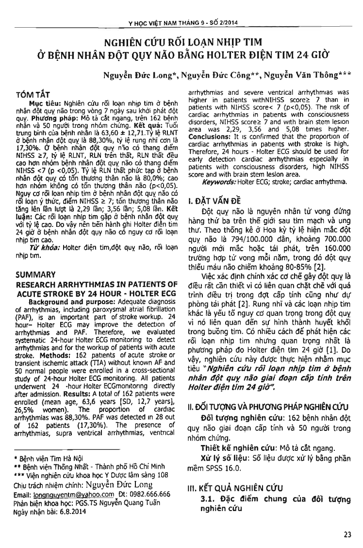Nghiên cứu rối loạn nhịp tim ở bệnh nhân đột quỵ não bằng Holter điện tim 24 giờ