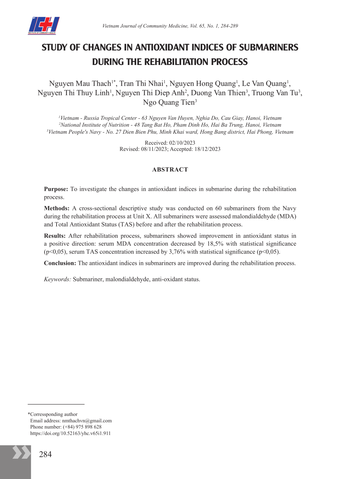 Đánh giá sự biến đổi các chỉ số chống oxy hóa ở thủy thủ tàu ngầm trong quá trình an dưỡng. Phương pháp nghiên cứu: Mô tả cắt ngang tự đối chứng trên 60 thủy thủ thuộc Quân chủng Hải quân tham gia an dưỡng tại đơn vị X từ 7/2022 đến 7/2023. Đánh giá sự biến đổi các chỉ số chống oxy hóa của thủy thủ trước và sau an dưỡng, gồm: malondialdehyde (MDA) và trạng thái chống oxy hóa toàn phần (Total anti-oxidant status - TAS). Kết quả nghiên cứu: Sau an dưỡng, thủy thủ có sự cải thiện trạng thái chống oxy hóa theo chiều hướng tốt hơn: giá trị trung vị nồng độ MDA huyết tương giảm 18,5% có ý nghĩa thống kê (p<0,05), giá trị trung vị nồng độ TAS huyết tương tăng 3,76% có ý nghĩa thống kê (p<0,05).Kết luận: Các chỉ số chống oxy hóa ở thủy thủ tàu ngầm được cải thiện tốt hơn trong quá trình an dưỡng.