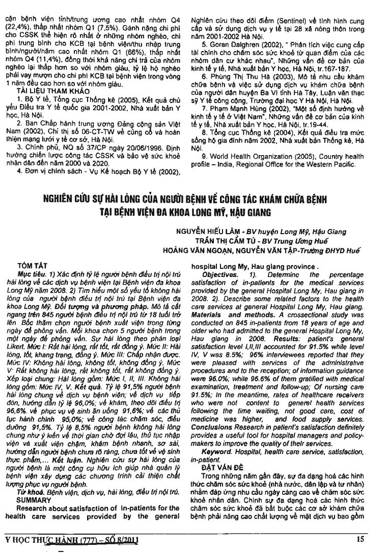 Nghiên cứu sự hài lòng của người bệnh về công tác khám chữa bệnh tại bệnh viện đa khoa Long Mỹ, Hậu Giang