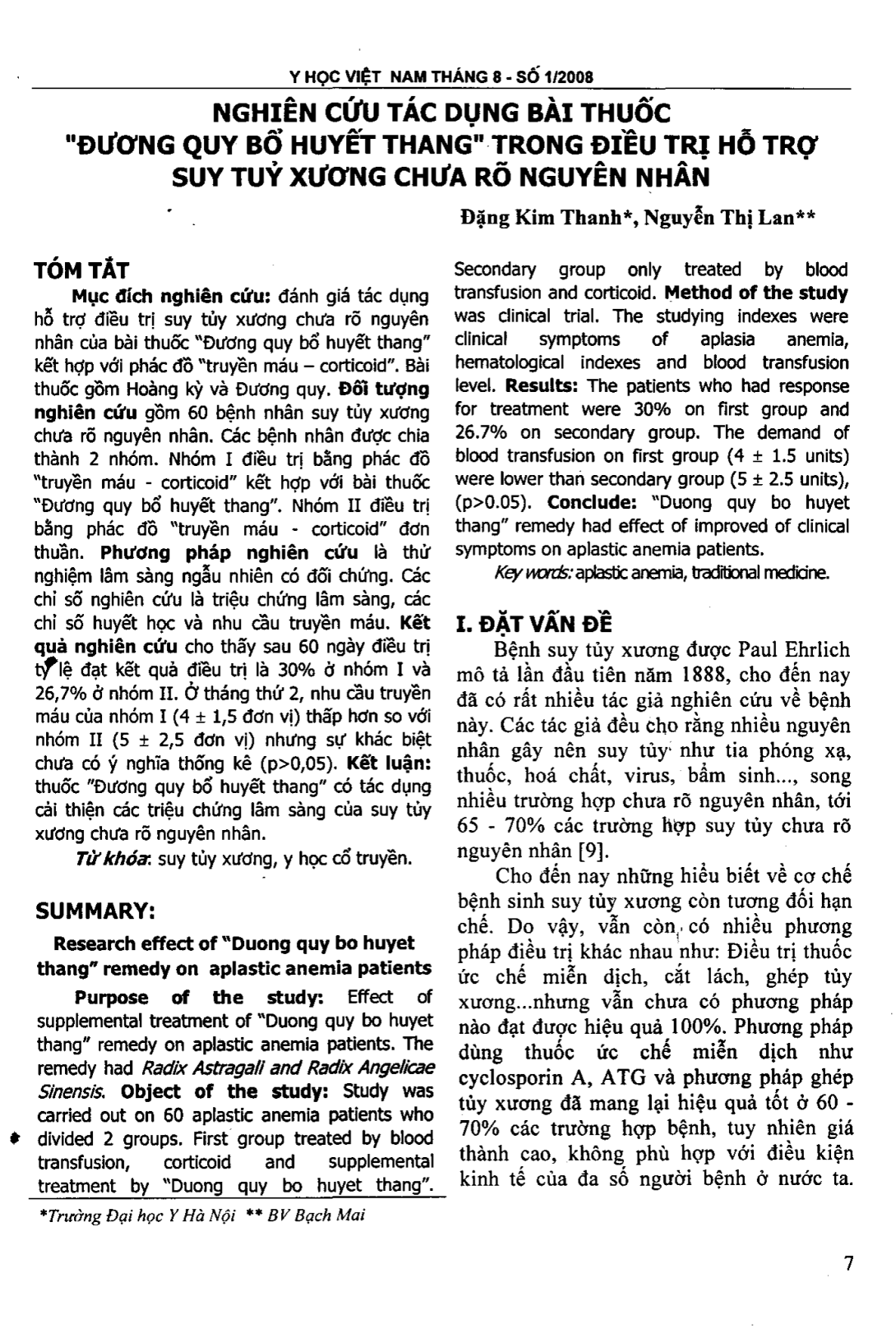 Nghiên cứu tác dụng bài thuốc “đương quy bổ huyết thang” trong điều trị hỗ trợ suy tuỷ xương chưa rõ nguyên nhân