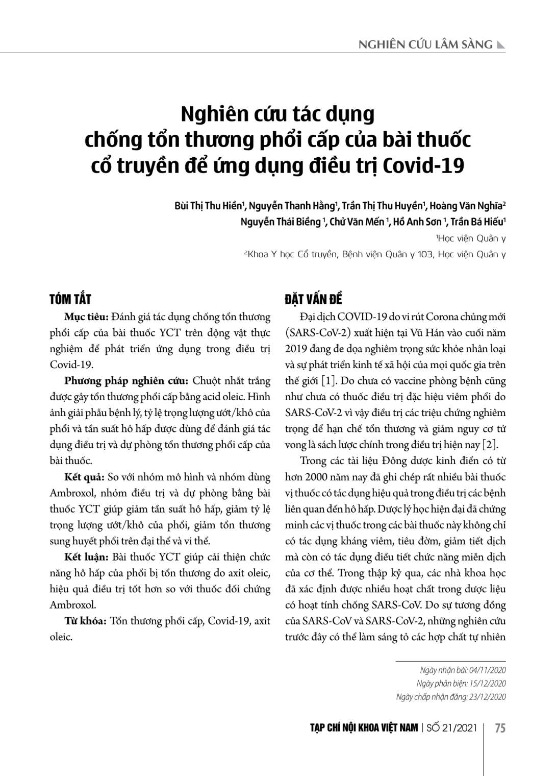Đánh giá tác dụng chống tổn thương phổi cấp của bài thuốc YCT trên động vật thực nghiệm để phát triển ứng dụng trong điều trị Covid-19. Phương pháp nghiên cứu: Chuột nhắt trắng được gây tổn thương phổi cấp bằng acid oleic. Hình ảnh giải phẫu bệnh lý, tỷ lệ trọng lượng ướt/khô của phổi và tần suất hô hấp được dùng để đánh giá tác dụng điều trị và dự phòng tổn thương phổi cấp của bài thuốc. Kết quả: So với nhóm mô hình và nhóm dùng Ambroxol, nhóm điều trị và dự phòng bằng bài thuốc YCT giúp giảm tần suất hô hấp, giảm tỷ lệ trọng lượng ướt/khô của phổi, giảm tổn thương sung huyết phổi trên đại thể và vi thể. Kết luận: Bài thuốc YCT giúp cải thiện chức năng hô hấp của phổi bị tổn thương do axit oleic, hiệu quả điều trị tốt hơn so với thuốc đối chứng Ambroxol.