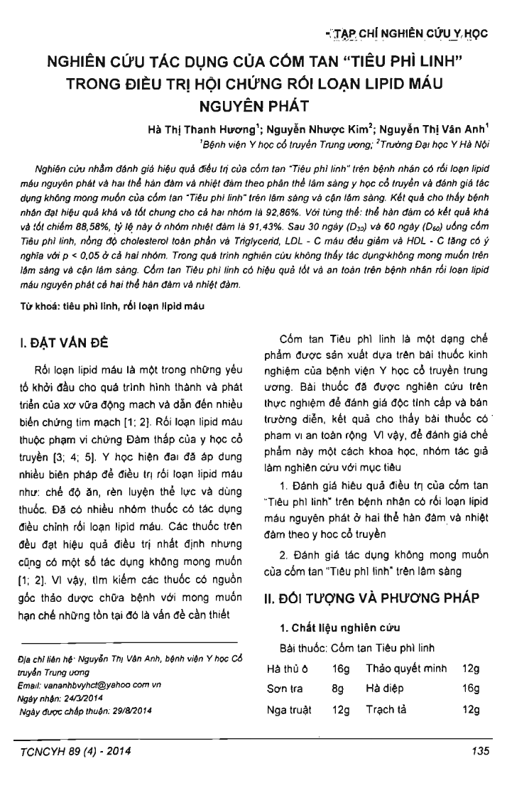 The objectives were to evaluate the treatment effects of "Tieu phi linh" in patients with primary Lipid Metabolism Disorders in two types hot damp and cold damp side effects 9f "Tieu phi linh" on clinical and paraclinical. It showed that average and good effects in both groups was 92.86 percent. With each type, in cold damp group 88.58 percent patients had average and good effects. The number of this in hot damp group was 91.43 percent. After 30 days (D30) and 60 days (D60) p,atients used "Tieu phi linh", cholesterol levels and triglycerides, HDL - C decreased and LDL - C level increased significantly with p 0.05 in both two groups. There is no side effect of "Tieu phi linh" was found during the treatment of these patients on clinical and paraclinical. The study suggests that ''Tieu phi linh" is effective in the treatment of primary Lipid Metabolism Disorders and safely.