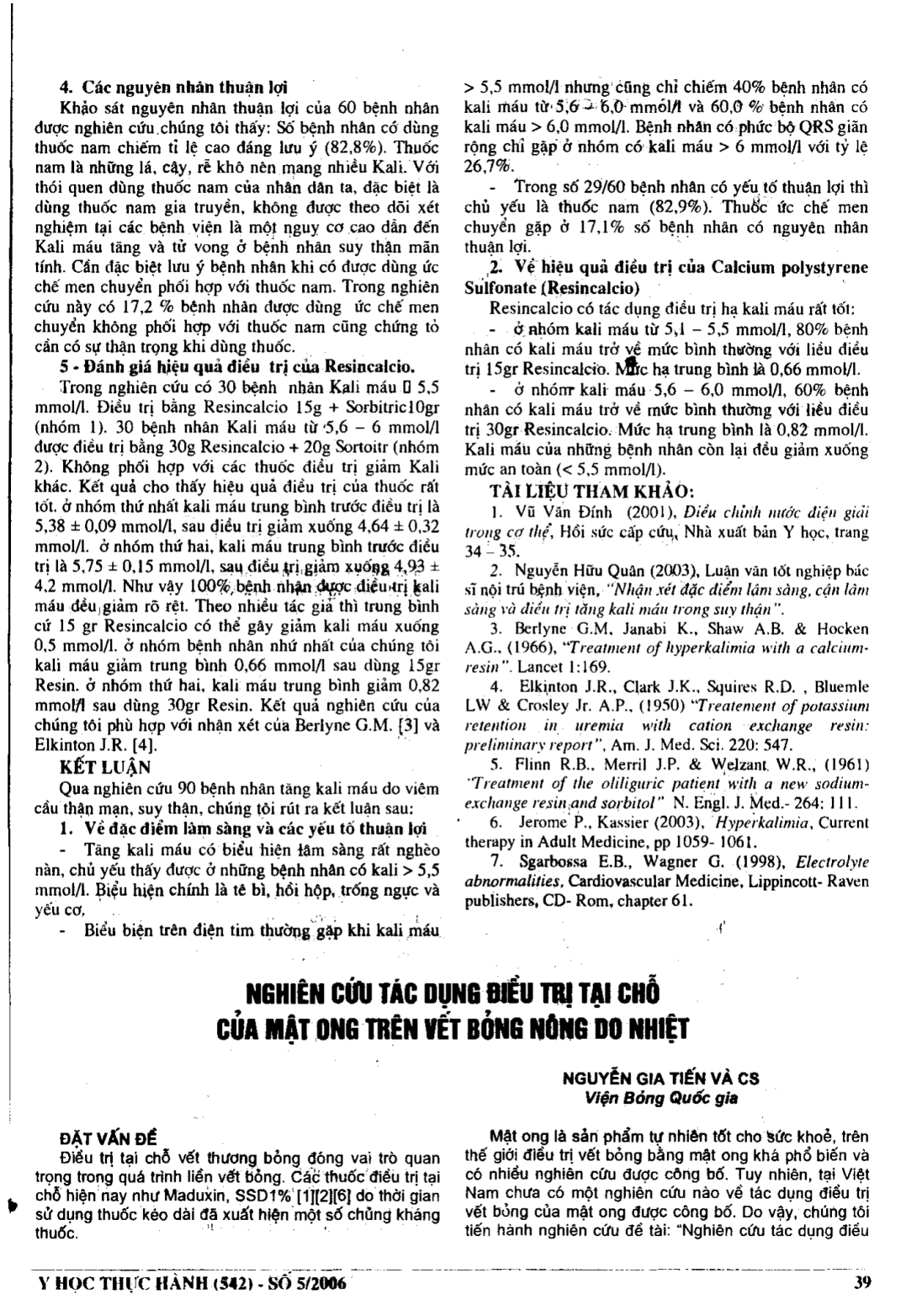 Nghiên cứu tác dụng của mật ong trong điều trị cho 30 bệnh nhân bị bỏng nóng do nhiệt. Kết quả cho thấy, mật ong có tác tác dụng ức chế sự phát triển của vi khuẩn tại vết bỏng; Mật ong conf có tác dụng chống viêm, kích thích biểu mô hoá tại chỗ vết thương bỏng nhanh hơn so với SSD 1% .