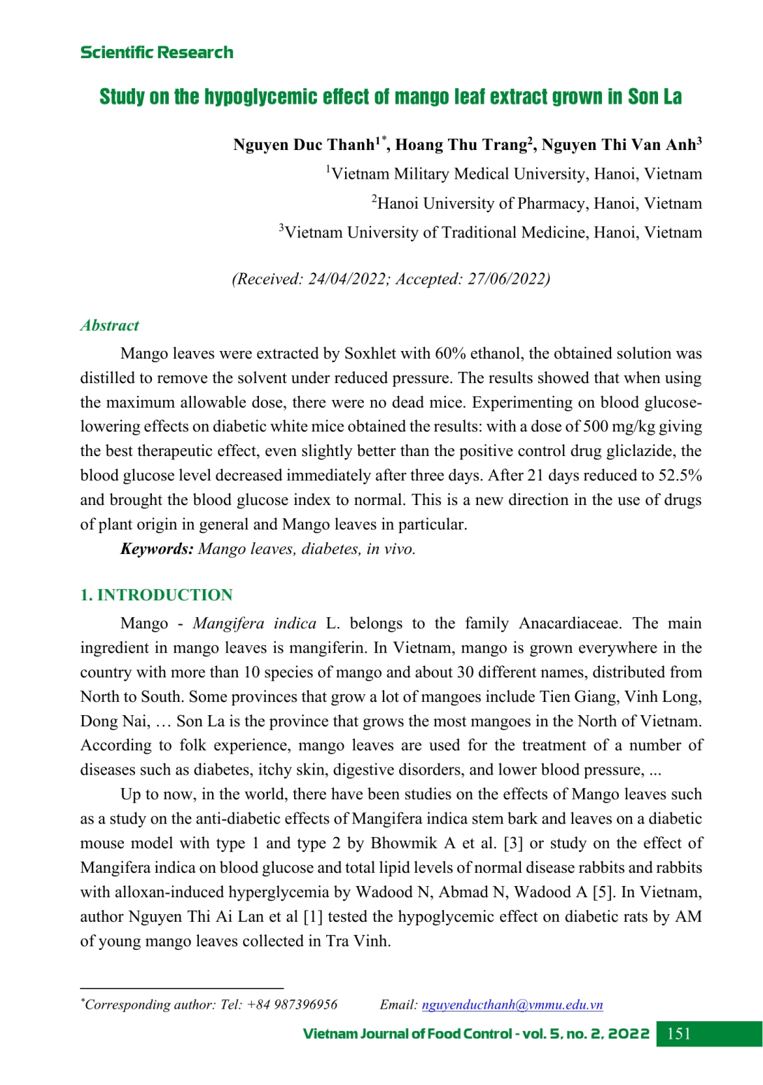 Mango leaves were extracted by Soxhlet with 60% ethanol, the obtained solution was distilled to remove the solvent under reduced pressure. The results showed that when using the maximum allowable dose, there were no dead mice. Experimenting on blood glucose- lowering effects on diabetic white mice obtained the results: with a dose of 500 mg/kg giving the best therapeutic effect, even slightly better than the positive control drug gliclazide, the blood glucose level decreased immediately after three days. After 21 days reduced to 52.5% and brought the blood glucose index to normal. This is a new direction in the use of drugs of plant origin in general and Mango leaves in particular.