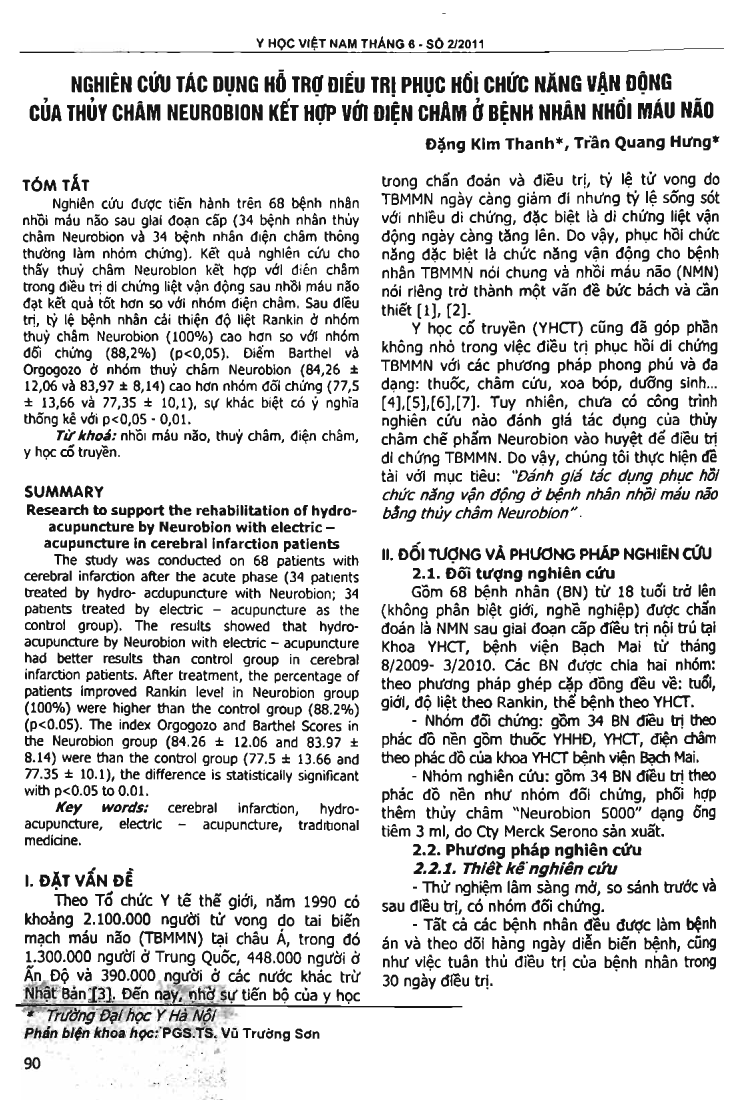 Nghiên cứu tác dụng hỗ trợ điều trị phục hồi chức năng vận động của thủy châm Neurobion kết hợp với điện châm ở bệnh nhân nhồi máu não