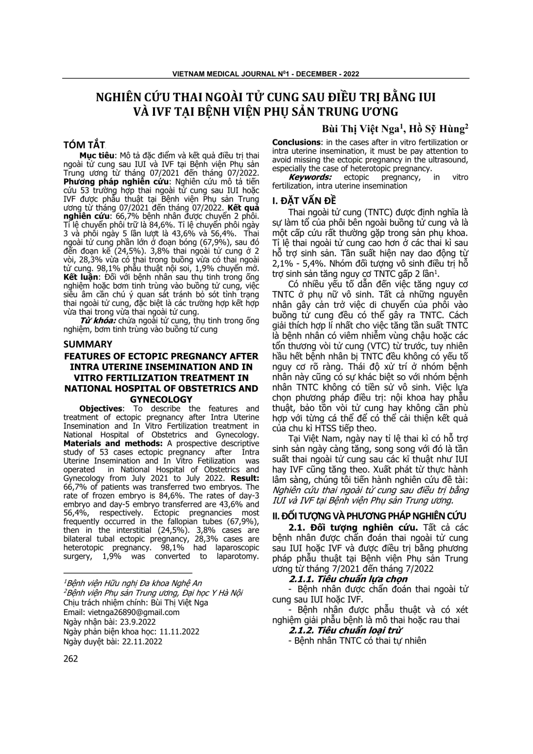 To describe the features and treatment of ectopic pregnancy after Intra Uterine Insemination and In Vitro Fertilization treatment in National Hospital of Obstetrics and Gynecology. Materials and methods: A prospective descriptive study of 53 cases ectopic pregnancy after Intra Uterine Insemination and In Vitro Fetilization was operated in National Hospital of Obstetrics and Gynecology from July 2021 to July 2022. Result: 66,7% of patients was transferred two embryos. The rate of frozen embryo is 84,6%. The rates of day-3 embryo and day-5 embryo transferred are 43,6% and 56,4%, respectively. Ectopic pregnancies most frequently occurred in the fallopian tubes (67,9%), then in the interstitial (24,5%). 3,8% cases are bilateral tubal ectopic pregnancy, 28,3% cases are heterotopic pregnancy. 98,1% had laparoscopic surgery, 1,9% was converted to laparotomy. Conclusions: in the cases after in vitro fertilization or intra uterine insemination, it must be pay attention to avoid missing the ectopic pregnancy in the ultrasound, especially the case of heterotopic pregnancy.