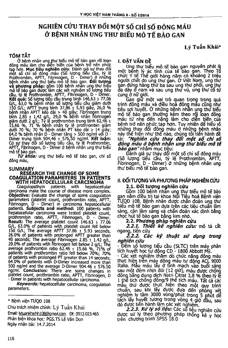 Coagulopathyin patients with hepatocellular carcinoma make the course of disease more complex. Objective: Evaluate the change of some coagulation parameters (platelet count, prothrombin ratio, APTT, Fibrinogen.c. D - Dimer) in carcinoma hepatocellular patients. Subjects and method: 100 patients with hepatocellular cardnoma were tested platelet count, prothrombin ratio, APTT, Fibrinogen, D - Dimer. Result: The average platelet count 146.63 + or - 77.06 G/L, 63.0 percent of patients with platelet count fell below 150 G/L; The average APTT 37.86 + or - 5.93 seconds, 26.0 percent of patients with prolonged APTT greater than 40 seconds; The average Fibrinogen 2.85 + or - 1.42 g/L, 29.0 percent of patients with fibrinogen fell below 2 g/L; The average prothrombin ratio 62.46 :t 15.66 percent, 71 percent of patients with prothrombin ratio fell below 70 percent; 70 percent of patients with prolonged PT greater than 14 seconds; 64.0 percent of patients with D-Dimer increased more than 500 ng/ml and the average D-Dimer 904.46 + or - 576.50 ng/ml. Conclusion: There are some changes in platelet count, prothrombin ratio, APTT, Fibrinogen, D - Dimer in patients with hepatocellular carcinoma.