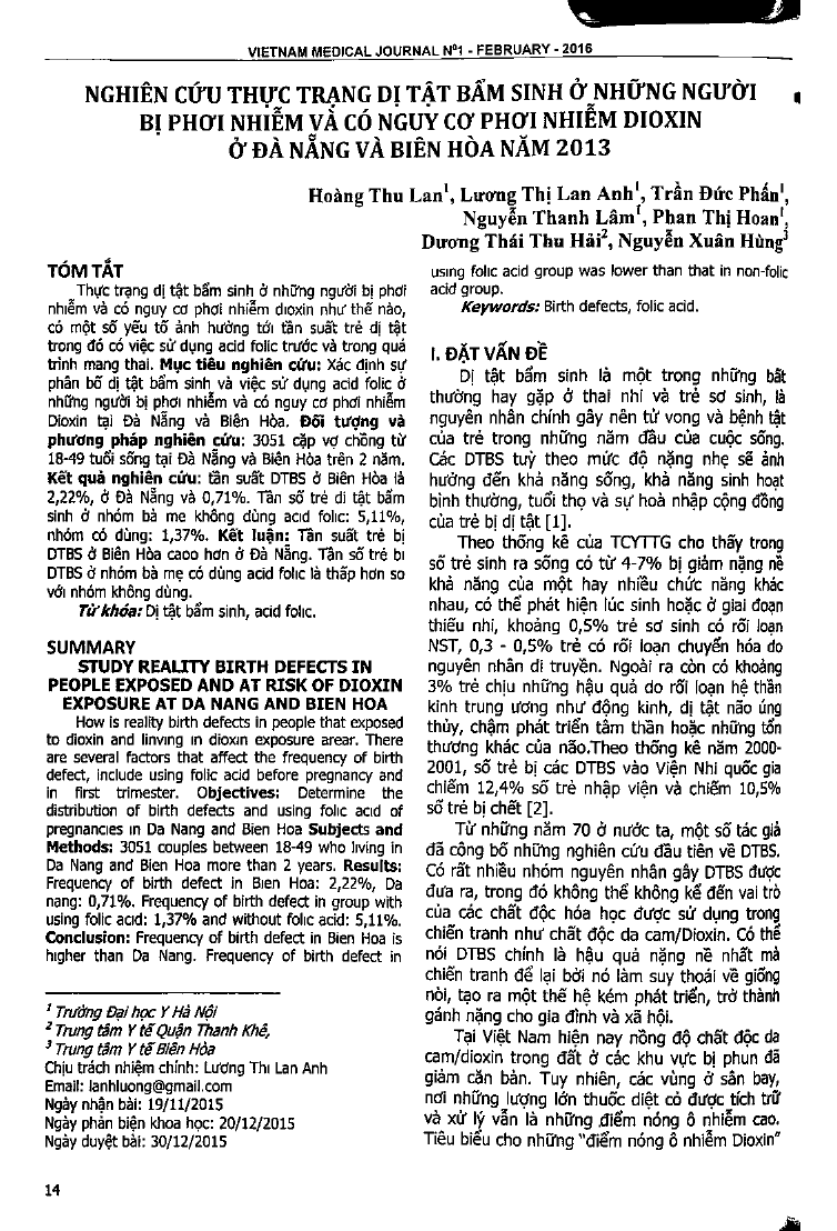 Nghiên cứu thực trạng dị tật bẩm sinh ở những người bị phơi nhiễm và có nguy cơ phơi nhiễm dioxin ở Đà Nẵng và Biên Hòa năm 2013