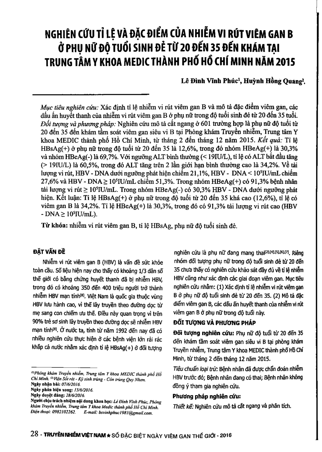 Nghiên cứu tỉ lệ và đặc điểm của virut viêm gan B ở phụ nữ độ tuổi sinh đẻ từ 20 đến 35 đến khám tại Trung tâm Y khoa Medic thành phố Hồ Chí Minh năm 2015