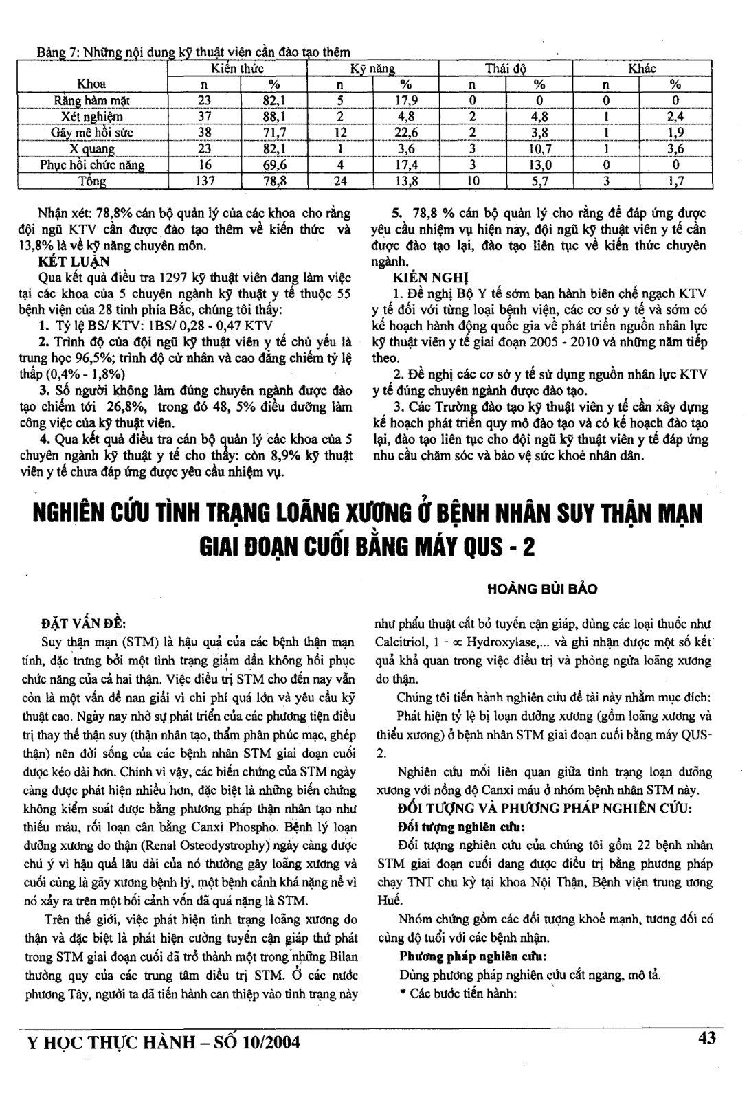 Nghiên cứu mật độ xương ở 22 trường hợp suy thận mạn (STM) giai đoạn cuối chạy thận nhân tạo chu kỳ ở bệnh viện trung ương Huế và 37 trường hợp thuộc nhóm chứng bằng máy QUS-2. Tỷ lệ bệnh nhân STM giai đoạn cuối chạy thận nhân tạo chu kỳ bị loạn dưỡng xương là 63,6% . Có mối liên hệ giữa tình trạng loạn dưỡng xương và nồng độ canxi ion hoá của máu. Các bệnh nhân có nồng độ canxi máu thấp thì khả năng bị loạn dưỡng xương cao hơn.