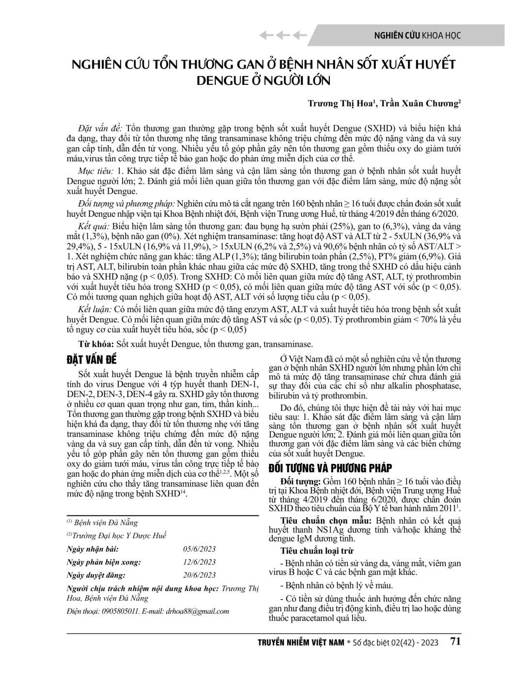 Tổn thương gan thường gặp trong bệnh sốt xuất huyết Dengue (SXHD) và biểu hiện khá đa dạng, thay đổi từ tổn thương nhẹ tăng transaminase không triệu chứng đến mức độ nặng vàng da và suy gan cấp tính, dẫn đến tử vong. Nhiều yếu tố góp phần gây nên tổn thương gan gồm thiếu oxy do giảm tưới máu,virus tấn công trực tiếp tế bào gan hoặc do phản ứng miễn dịch của cơ thể. Mục tiêu: 1. Khảo sát đặc điểm lâm sàng và cận lâm sàng tổn thương gan ở bệnh nhân sốt xuất huyết Dengue người lớn; 2. Đánh giá mối liên quan giữa tổn thương gan với đặc điểm lâm sàng, mức độ nặng sốt xuất huyết Dengue. Đối tượng và phương pháp: Nghiên cứu mô tả cắt ngang trên 160 bệnh nhân ≥ 16 tuổi được chẩn đoán sốt xuất huyết Dengue nhập viện tại Khoa Bệnh nhiệt đới, Bệnh viện Trung ương Huế, từ tháng 4/2019 đến tháng 6/2020. Kết quả: Biểu hiện lâm sàng tổn thương gan: đau bụng hạ sườn phải (25%), gan to (6,3%), vàng da vàng mắt (1,3%), bệnh não gan (0%). Xét nghiệm transaminase: tăng hoạt độ AST và ALT từ 2 - 5xULN (36,9% và 29,4%), 5 - 15xULN (16,9% và 11,9%), > 15xULN (6,2% và 2,5%) và 90,6% bệnh nhân có tỷ số AST/ALT > 1. Xét nghiệm chức năng gan khác: tăng ALP (1,3%); tăng bilirubin toàn phần (2,5%), PT% giảm (6,9%). Giá trị AST, ALT, bilirubin toàn phần khác nhau giữa các mức độ SXHD, tăng trong thể SXHD có dấu hiệu cảnh báo và SXHD nặng (p < 0,05). Trong SXHD: Có mối liên quan giữa mức độ tăng AST, ALT, tỷ prothrombin với xuất huyết tiêu hóa trong SXHD (p < 0,05), có mối liên quan giữa mức độ tăng AST với sốc (p < 0,05). Có mối tương quan nghịch giữa hoạt độ AST, ALT với số lượng tiểu cầu (p < 0,05). Kết luận: Có mối liên quan giữa mức độ tăng enzym AST, ALT và xuất huyết tiêu hóa trong bệnh sốt xuất huyết Dengue. Có mối liên quan giữa mức độ tăng AST và sốc (p < 0,05). Tỷ prothrombin giảm < 70% là yếu tố nguy cơ của xuất huyết tiêu hóa, sốc (p < 0,05).