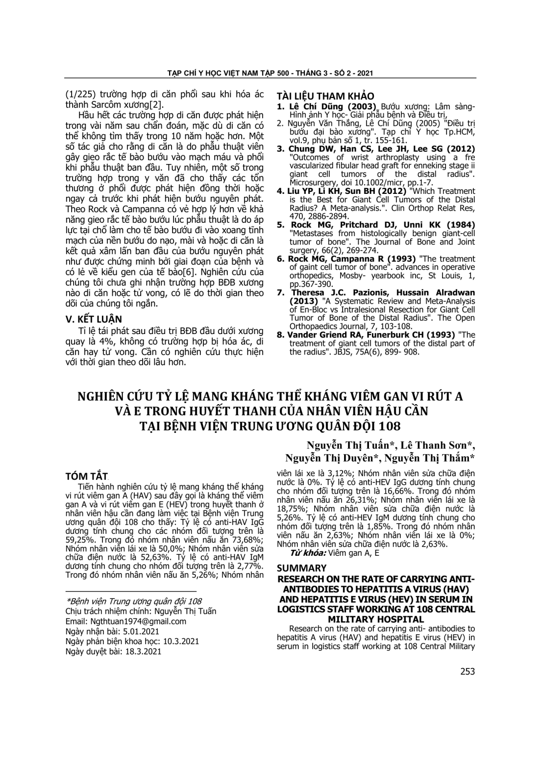 Tiến hành nghiên cứu tỷ lệ mang kháng thể kháng vi rút viêm gan A (HAV) sau đây gọi là kháng thể viêm gan A và vi rút viêm gan E (HEV) trong huyết thanh ở nhân viên hậu cần đang làm việc tại Bệnh viện Trung ương quân đội 108 cho thấy: Tỷ lệ có anti-HAV IgG dương tính chung cho các nhóm đối tượng trên là 59,25%. Trong đó nhóm nhân viên nấu ăn 73,68%; Nhóm nhân viên lái xe là 50,0%; Nhóm nhân viên sửa chữa điện nước là 52,63%. Tỷ lệ có anti-HAV IgM dương tính chung cho nhóm đối tượng trên là 2,77%. Trong đó nhóm nhân viên nấu ăn 5,26%; Nhóm nhân viên lái xe là 3,12%; Nhóm nhân viên sửa chữa điện nước là 0%. Tỷ lệ có anti-HEV IgG dương tính chung cho nhóm đối tượng trên là 16,66%. Trong đó nhóm nhân viên nấu ăn 26,31%; Nhóm nhân viên lái xe là 18,75%; Nhóm nhân viên sửa chữa điện nước là 5,26%. Tỷ lệ có anti-HEV IgM dương tính chung cho nhóm đối tượng trên là 1,85%. Trong đó nhóm nhân viên nấu ăn 2,63%; Nhóm nhân viên lái xe là 0%; Nhóm nhân viên sửa chữa điện nước là 2,63%.