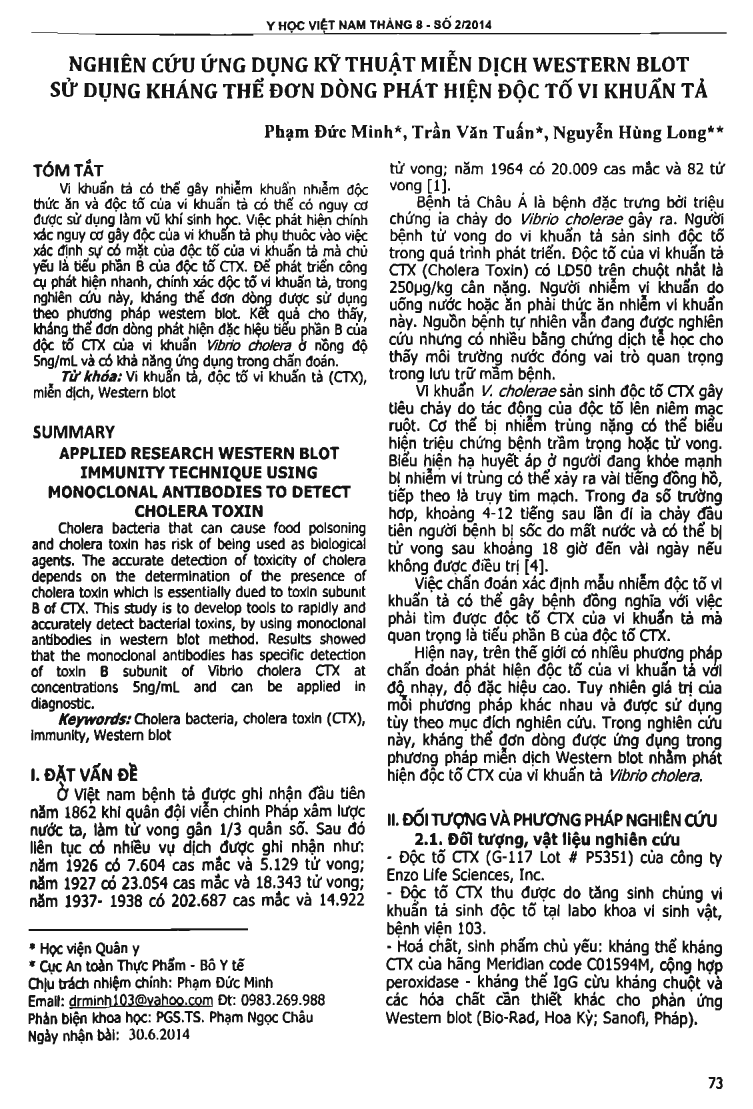 Nghiên cứu ứng dụng kỹ thuật miễn dịch Western Blot sử dụng kháng thể đơn dòng phát hiện độc tố vi khuẩn tả