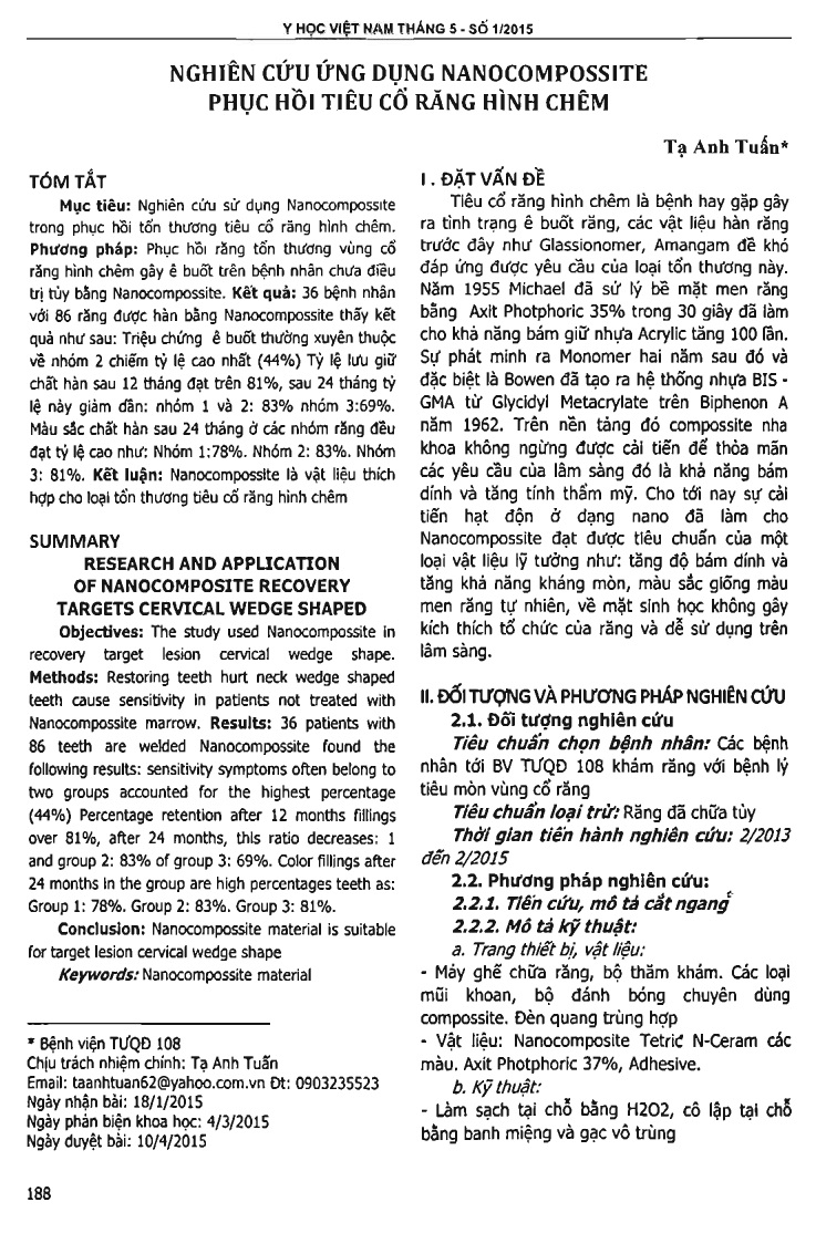 Objectives: The study used Nanocompossite in recovery target lesion cervical wedge shape. Methods: Restoring teeth hurt neck wedge shaped teeth cause sensitivity in patients not treated with Nanocompossite marrow. Results: 36 patients with 86 teeth are welded Nanocompossite found the following results: sensitivity symptoms often belong to two groups accounted for the highest percentage (44 percent) Percentage retention after 12 months fillings over 81 percent, after 24 months, this ratio decreases: 1 and group 2: 83 percent of group 3: 69 percent. Color fillings after 24 months in the group are high percentages teeth as: Group 1: 78 percent. Group 2: 83 percent. Group 3: 81 percent. Conclusion: Nanocompossite material is suitable for target lesion cervical wedge shape.