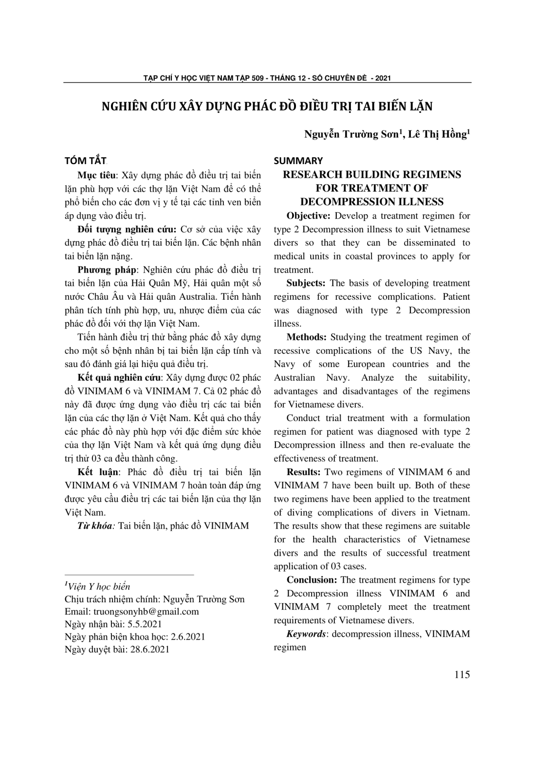Xây dựng phác đồ điều trị tai biến lặn phù hợp với các thợ lặn Việt Nam để có thể phổ biến cho các đơn vị y tế tại các tỉnh ven biển áp dụng vào điều trị. Đối tượng nghiên cứu: Cơ sở của việc xây dựng phác đồ điều trị tai biến lặn. Các bệnh nhân tai biến lặn nặng. Phương pháp: Nghiên cứu phác đồ điều trị tai biến lặn của Hải Quân Mỹ, Hải quân một số nước Châu Âu và Hải quân Australia. Tiến hành phân tích tính phù hợp, ưu, nhược điểm của các phác đồ đối với thợ lặn Việt Nam. Tiến hành điều trị thử bằng phác đồ xây dựng cho một số bệnh nhân bị tai biến lặn cấp tính và sau đó đánh giá lại hiệu quả điều trị. Kết quả nghiên cứu: Xây dựng được 02 phác đồ VINIMAM 6 và VINIMAM 7. Cả 02 phác đồ này đã được ứng dụng vào điều trị các tai biến lặn của các thợ lặn ở Việt Nam. Kết quả cho thấy các phác đồ này phù hợp với đặc điểm sức khỏe của thợ lặn Việt Nam và kết quả ứng dụng điều trị thử 03 ca đều thành công. Kết luận: Phác đồ điều trị tai biến lặn VINIMAM 6 và VINIMAM 7 hoàn toàn đáp ứng được yêu cầu điều trị các tai biến lặn của thợ lặn Việt Nam.