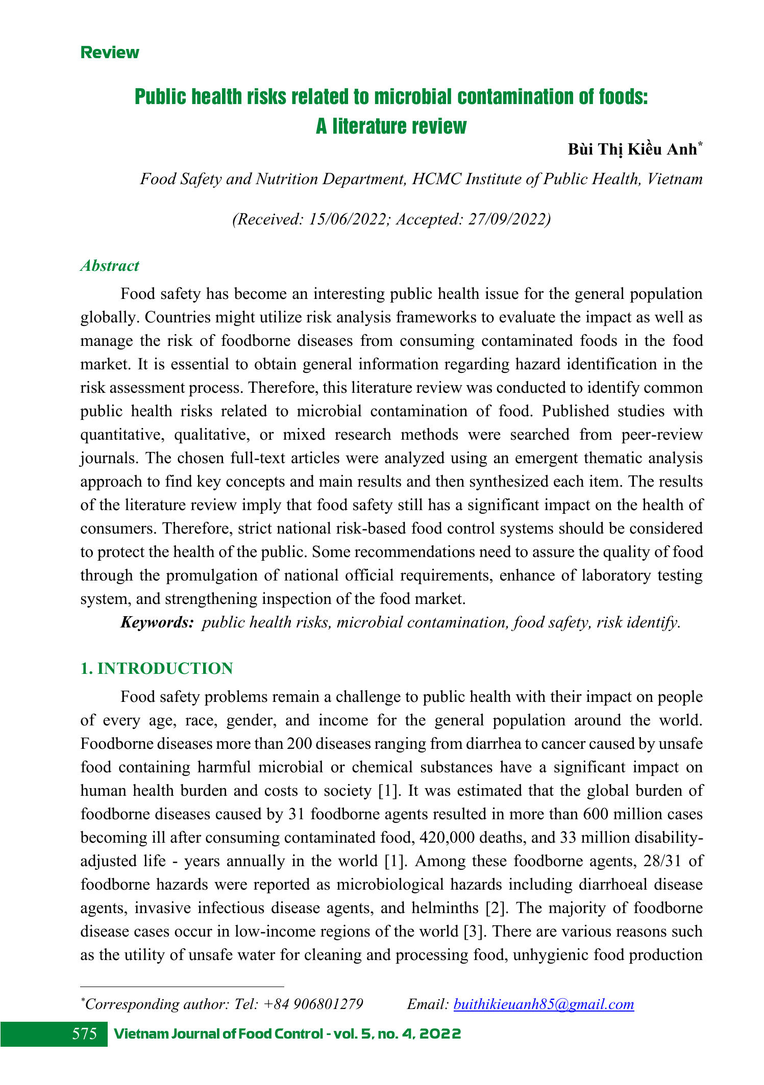 An toàn thực phẩm đã trở thành một vấn đề sức khỏe cộng đồng đáng quan tâm đối với người dân nói chung trên toàn thế giới. Các quốc gia có thể sử dụng khung phân tích rủi ro để đánh giá tác động cũng như quản lý nguy cơ mắc các bệnh truyền qua thực phẩm do tiêu thụ thực phẩm bị ô nhiễm trên thị trường thực phẩm. Điều cần thiết là phải có được thông tin chung liên quan đến việc xác định mối nguy trong quá trình đánh giá rủi ro. Do đó, tổng quan tài liệu này được thực hiện để xác định các nguy cơ sức khỏe cộng đồng phổ biến liên quan đến ô nhiễm vi sinh vật trong thực phẩm. Các nghiên cứu đã công bố với phương pháp nghiên cứu định lượng, định tính hoặc hỗn hợp được tìm kiếm từ các tạp chí bình duyệt. Các bài báo toàn văn được phân tích bằng cách sử dụng phương pháp phân tích theo chủ đề nổi bật để tìm ra các khái niệm chính và kết quả chính; sau đó được thảo luận tổng hợp từng mục. Kết quả từ bài tổng quan tài liệu này cho thấy an toàn thực phẩm vẫn còn ảnh hưởng đáng kể đến sức khỏe của người tiêu dùng. Do đó, các hệ thống kiểm soát thực phẩm quốc gia nghiêm ngặt dựa trên rủi ro cần được xem xét để bảo vệ sức khỏe của cộng đồng. Một số khuyến nghị, cần đảm bảo chất lượng thực phẩm thông qua việc ban hành các văn bản quy phạm pháp luật quốc gia, tăng cường hệ thống phòng kiểm nghiệm, tăng cường kiểm tra thị trường thực phẩm.