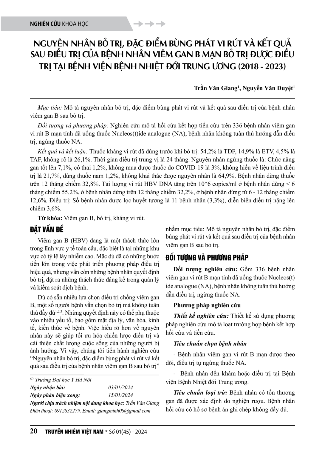 Mô tả nguyên nhân bỏ trị, đặc điểm bùng phát vi rút và kết quả sau điều trị của bệnh nhân viêm gan B sau bỏ trị. Đối tượng và phương pháp: Nghiên cứu mô tả hồi cứu kết hợp tiến cứu trên 336 bệnh nhân viêm gan vi rút B mạn tính đã uống thuốc Nucleos(t)ide analogue (NA), bệnh nhân không tuân thủ hướng dẫn điều trị, ngừng thuốc NA. Kết quả và kết luận: Thuốc kháng vi rút đã dùng trước khi bỏ trị: 54,2% là TDF, 14,9% là ETV, 4,5% là TAF, không rõ là 26,1%. Thời gian điều trị trung vị là 24 tháng. Nguyên nhân ngừng thuốc là: Chức năng gan tốt lên 7,1%, có thai 1,2%, không mua được thuốc do COVID-19 là 3%, không hiểu về liệu trình điều trị là 21,7%, dùng thuốc nam 1,2%, không khai thác được nguyên nhân là 64,9%. Bệnh nhân dừng thuốc trên 12 tháng chiếm 32,8%. Tải lượng vi rút HBV DNA tăng trên 10^6 copies/ml ở bệnh nhân dừng < 6 tháng chiếm 55,2%, ở bệnh nhân dừng trên 12 tháng chiếm 32,2%, ở bệnh nhân dừng từ 6 - 12 tháng chiếm 12,6%. Điều trị: Số bệnh nhân được lọc huyết tương là 11 bệnh nhân (3,3%), diễn biến điều trị nặng lên chiếm 3,6%.