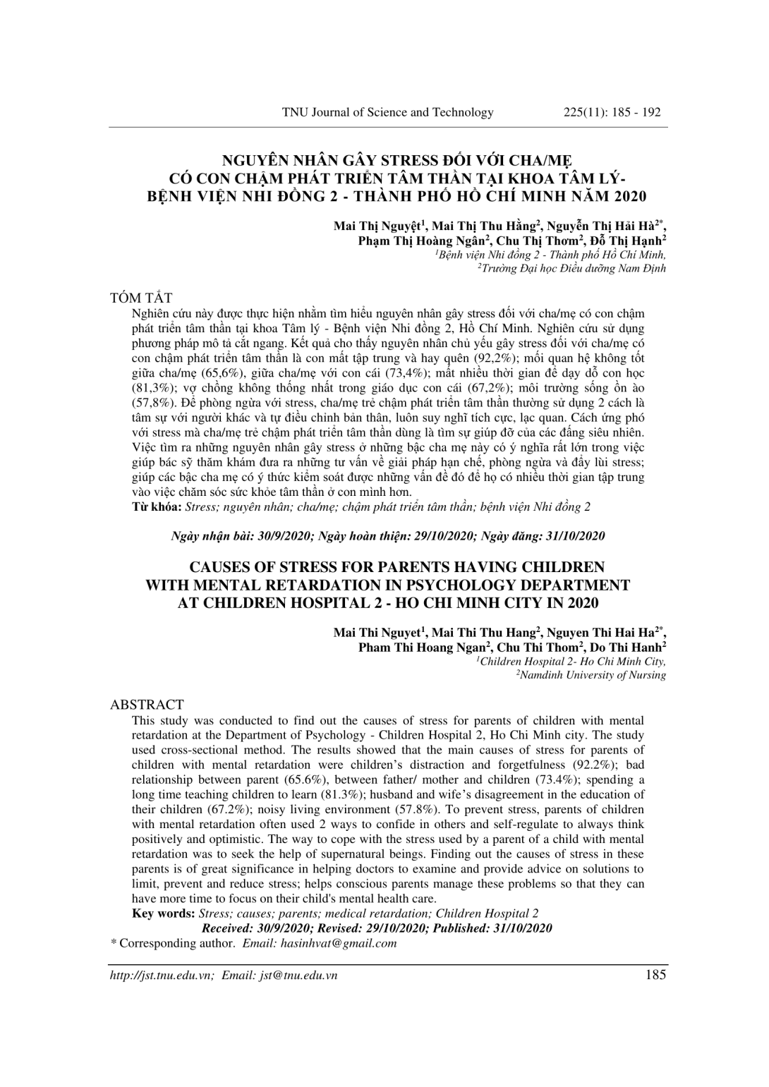 Nghiên cứu này được thực hiện nhằm tìm hiểu nguyên nhân gây stress đối với cha/mẹ có con chậm phát triển tâm thần tại khoa Tâm lý - Bệnh viện Nhi đồng 2, Hồ Chí Minh. Nghiên cứu sử dụng phương pháp mô tả cắt ngang. Kết quả cho thấy nguyên nhân chủ yếu gây stress đối với cha/mẹ có con chậm phát triển tâm thần là con mất tập trung và hay quên (92,2%); mối quan hệ không tốt giữa cha/mẹ (65,6%), giữa cha/mẹ với con cái (73,4%); mất nhiều thời gian để dạy dỗ con học (81,3%); vợ chồng không thống nhất trong giáo dục con cái (67,2%); môi trường sống ồn ào (57,8%). Để phòng ngừa với stress, cha/mẹ trẻ chậm phát triển tâm thần thường sử dụng 2 cách là tâm sự với người khác và tự điều chỉnh bản thân, luôn suy nghĩ tích cực, lạc quan. Cách ứng phó với stress mà cha/mẹ trẻ chậm phát triển tâm thần dùng là tìm sự giúp đỡ của các đấng siêu nhiên. Việc tìm ra những nguyên nhân gây stress ở những bậc cha mẹ này có ý nghĩa rất lớn trong việc giúp bác sỹ thăm khám đưa ra những tư vấn về giải pháp hạn chế, phòng ngừa và đẩy lùi stress; giúp các bậc cha mẹ có ý thức kiểm soát được những vấn đề đó để họ có nhiều thời gian tập trung vào việc chăm sóc sức khỏe tâm thần ở con mình hơn.