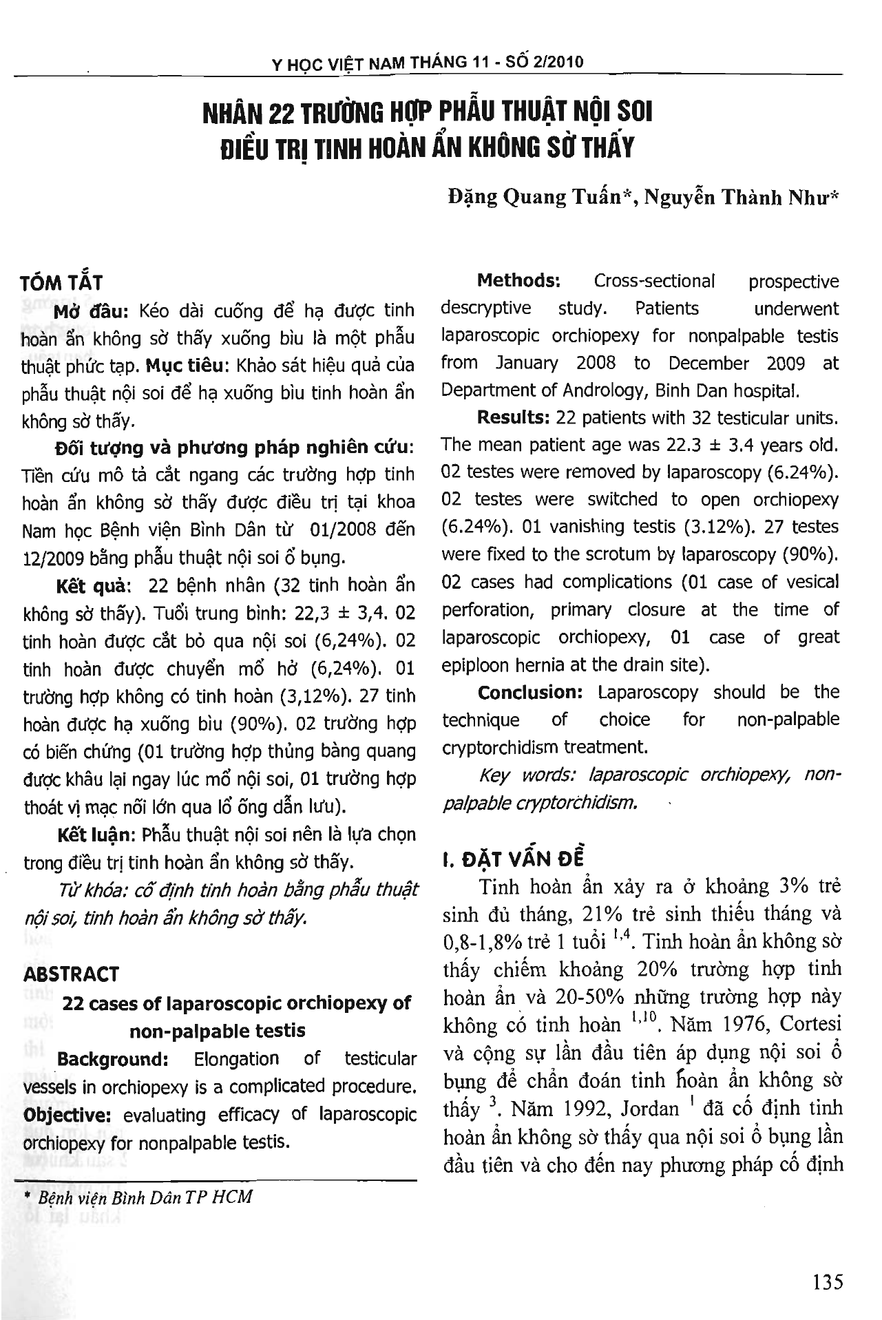 Nhân 22 trường hợp phẫu thuật nội soi điều trị tinh hoàn ẩn không sờ thấy