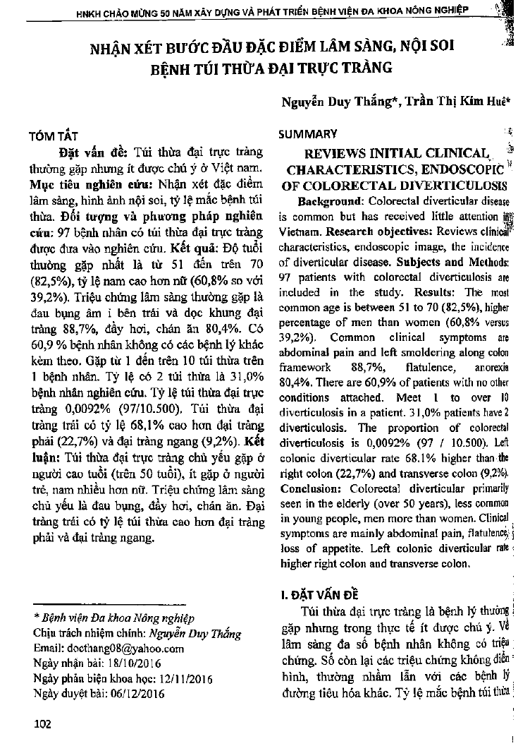 Nhận xét bước đầu đặc điểm lâm sàng, nội soi trên 97 bệnh nhân túi thừa đại trực tràng. Độ tuổi thường gặp nhật là từ 51 đến trên 70 tuổi, bệnh nhân nam chiếm tỷ lệ cao hơn bệnh nhân nữ. Triệu chứng lâm sàng thường gặp là đau bụng âm ỉ bên trái và dọc khung đại tràng, đầy hơi, chán ăn. Tỷ lệ có 2 túi thừa là 31,0 phần trăm. Túi thừa ở đại tràng trái gặp nhiều hơn ở đại tràng phải và đại tràng ngang.