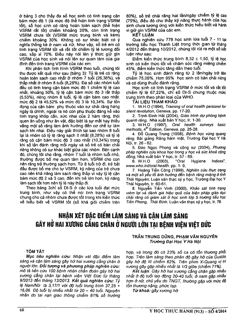 Objectives: Discribe characteristics of radiographic and clinical of open fracture of tibia and fibula in adults. Patients and method: Prospective study of 100 patients diagnosed open fracture of tibia and fibula in Viet Duc University Hospital from 9/2013 to 12/2013. Results: Prevalence of Male / Female is 3.17/1 with an average age of 37.25 + 16.06 get the most from age 20-40 years old. The cause of traffic accidents accounted for 81 percent of cases, and in 23 percent of cases that have hurt coordinate. On clinical followgrade open fractures of Gustilo grade III open fractures accounted for 62 percent. X-ray film on location fractures are the most common third middle (71 percent). Conclusion: Open fracture of tibia and fibula is most common encountered in working age 20-40 years, males were more than females, mainly due to traffic accidents, common vulnerability to severe and complicated.