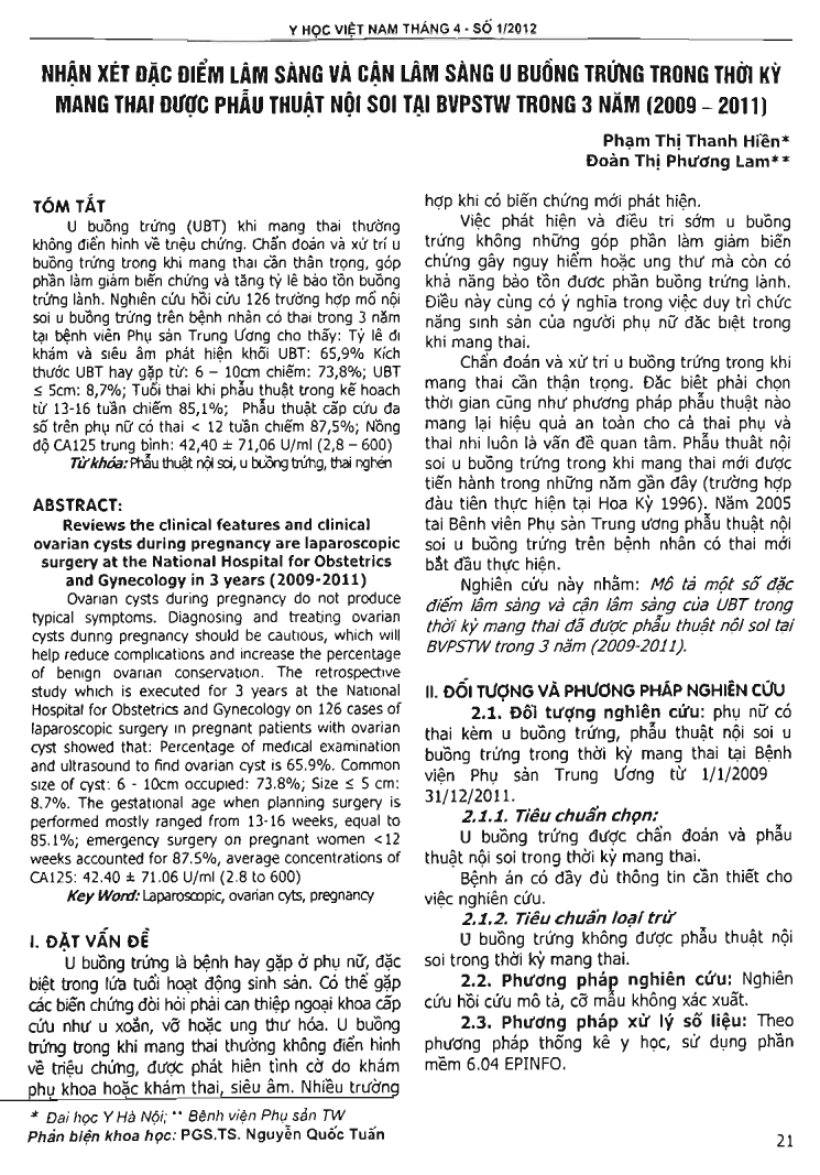 Nhận xét đặc điểm lâm sàng và cận lâm sàng u buồng trứng trong thời kỳ mang thai được phẫu thuật nội soi tại BVPSTW trong 3 năm (2009 - 2011)
