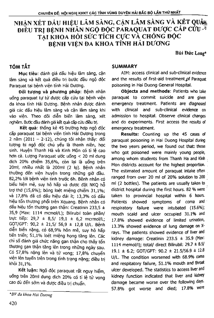 Aims: access clinical and sub-clinical evidence and the results of first-aid treatment of Paraquat poisoning in Hai Duong General Hospital. Objects and methods: Patients who take paraquat to commit suicide and are given emergency treatment. Patients are diagnosed with clinical and paraclinical evidence on admission to hospital. Observe clinical changes and do experiments. First access the results of emergency treatment. Results: Counting up the 45 cases of paraquat poisoning in Hai Duong Hospital during the two years period, the authors found out that: those who got poisoned were mainly young people, among whom students from Thanh Ha and Kinh Mon districts account for the highest proportion. The estimated amount of paraquat intake often ranged from over 20 ml of 20 percent solution to 200 ml (2 bottles). The patients are usually taken to district hospital during the first hours. 82 percent were taken to provincial hospital within 6 hours. Patients showed symptoms of coma and respiratory failure were intubated (15.6 percent); mouth scald and ulcer occupied 31.1 percent and 17.8 percent showed evidence of limited urination, 13.3 percent showed evidence of lung damage on Xrays. The patients showed evidence of liver and kidney damage: Creatinin 233.5 + or - 35.9 (Max: 1114 memol/l); total/direct Bilirubil: 29.7 + or - 8.5/ 19.1 + or - 6.2; GOT/GPT: 90.2 + or - 21.5/56.9 + or - 12.8 U/L. The condition worsened with 68.9 percent coma and respitatory failure, 51.1 percent mouth and throat ulcer developed. The statistics to access liver and kidney function indicated that liver and kidney damage became worse over the following days. 57.8 percent got worse and died; 17.8 percent were transferred to upper line in serious condition; 31.1 percent successful treatment. Conclusion: Paraquat poisoning is very dangerous. An intake of 20mI of paraquat solution would lead to high death rate in spite of early admission and standard treatment.