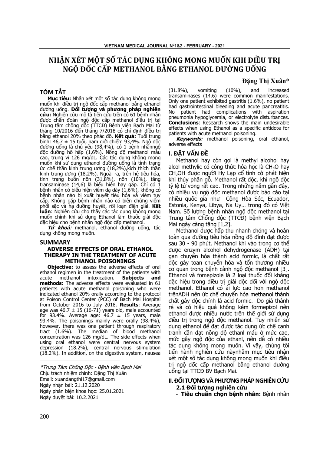 Nhận xét một số tác dụng không mong muốn khi điều trị ngộ đốc cấp methanol bằng ethanol đường uống. Đối tượng và phương pháp nghiên cứu: Nghiên cứu mô tả tiến cứu trên có 61 bệnh nhân được chẩn đoán ngộ độc cấp methanol điều trị tại Trung tâm chống độc (TTCĐ) Bệnh viện Bạch Mai từ tháng 10/2016 đến tháng 7/2018 có chỉ định điều trị bằng ethanol 20% theo phác đồ. Kết quả: Tuổi trung bình: 46,7 ± 15 tuổi, nam giới chiếm 93,4%. Ngộ độc đường uống là chủ yếu (98,4%), có 1 bệnh nhânngộ độc đường hô hấp (1,6%). Nồng độ methanol máu cao, trung vị 126 mg/dL. Các tác dụng không mong muốn khi sử dung ethanol đường uống là tình trạng ức chế thần kinh trung ương (18,2%),kích thích thần kinh trung ương (18,2%). Ngoài ra, trên hệ tiêu hóa, tình trạng buồn nôn (31,8%), nôn (10%), tăng transaminase (14,6) là biểu hiện hay gặp. Chỉ có 1 bệnh nhân có biểu hiện viêm dạ dày (1,6%), không có bệnh nhân nào bị xuất huyết tiêu hóa và viêm tụy cấp. Không gặp bệnh nhân nào có biến chứng viêm phổi sặc và hạ đường huyết, rối loạn điện giải. Kết luận: Nghiên cứu cho thấy các tác dụng không mong muốn chính khi sử dụng Ethanol làm thuốc giải độc đặc hiệu cho bệnh nhân ngộ độc cấp methanol.