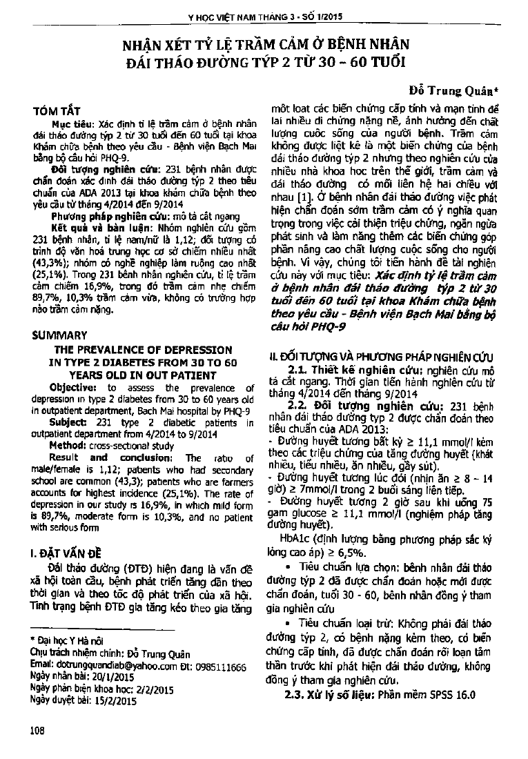 Nhận xét tỷ lệ trầm cảm của bệnh nhân đái tháo đường typ 2 từ 30-60 tuổi