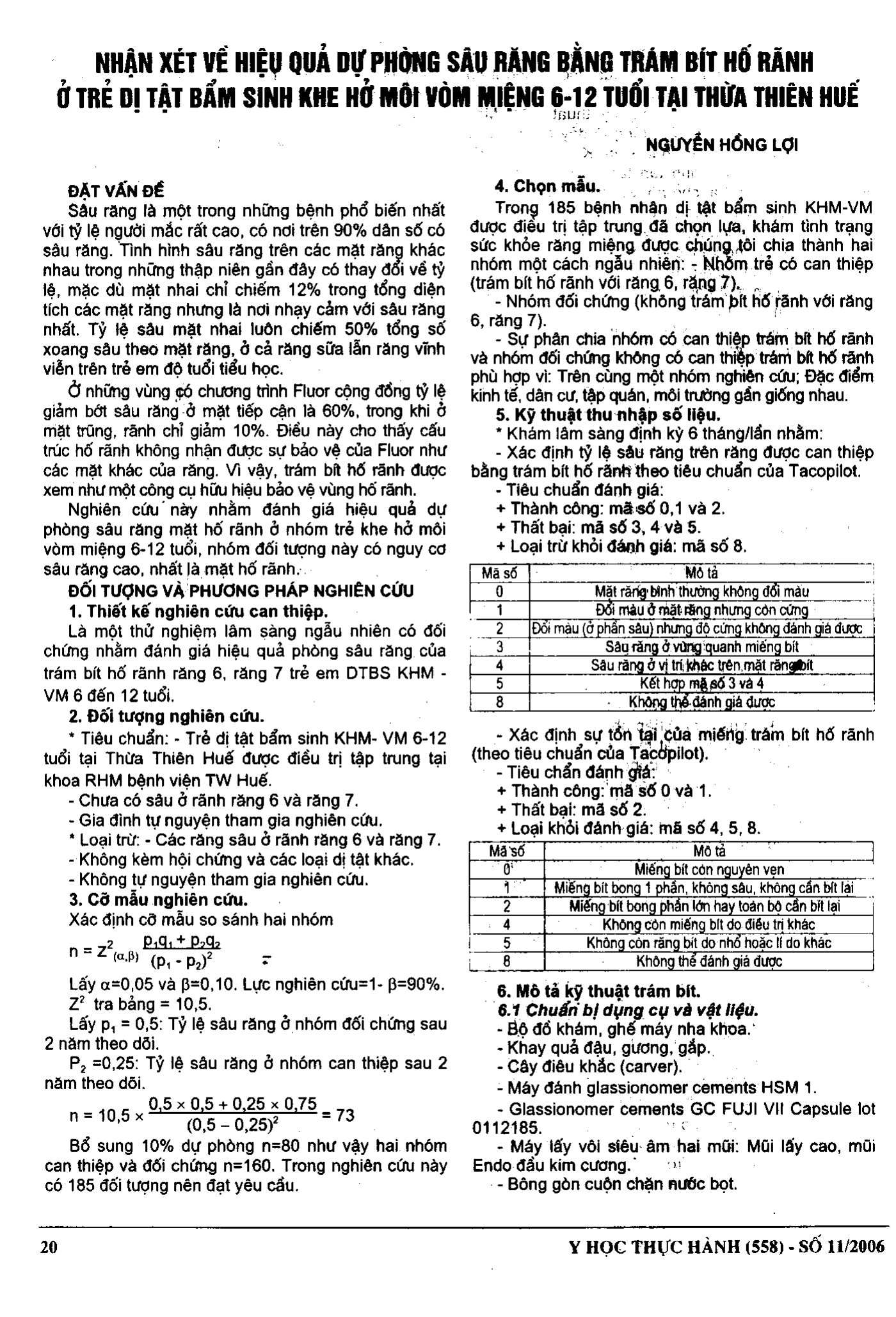 Nhận xét về hiệu quả dự phòng sâu răng bằng trám bít hố răng ở thể dị tật bẩm sinh khe hở môi vòm miệng 6-12 tuổi tại Thừa Thiên Huế