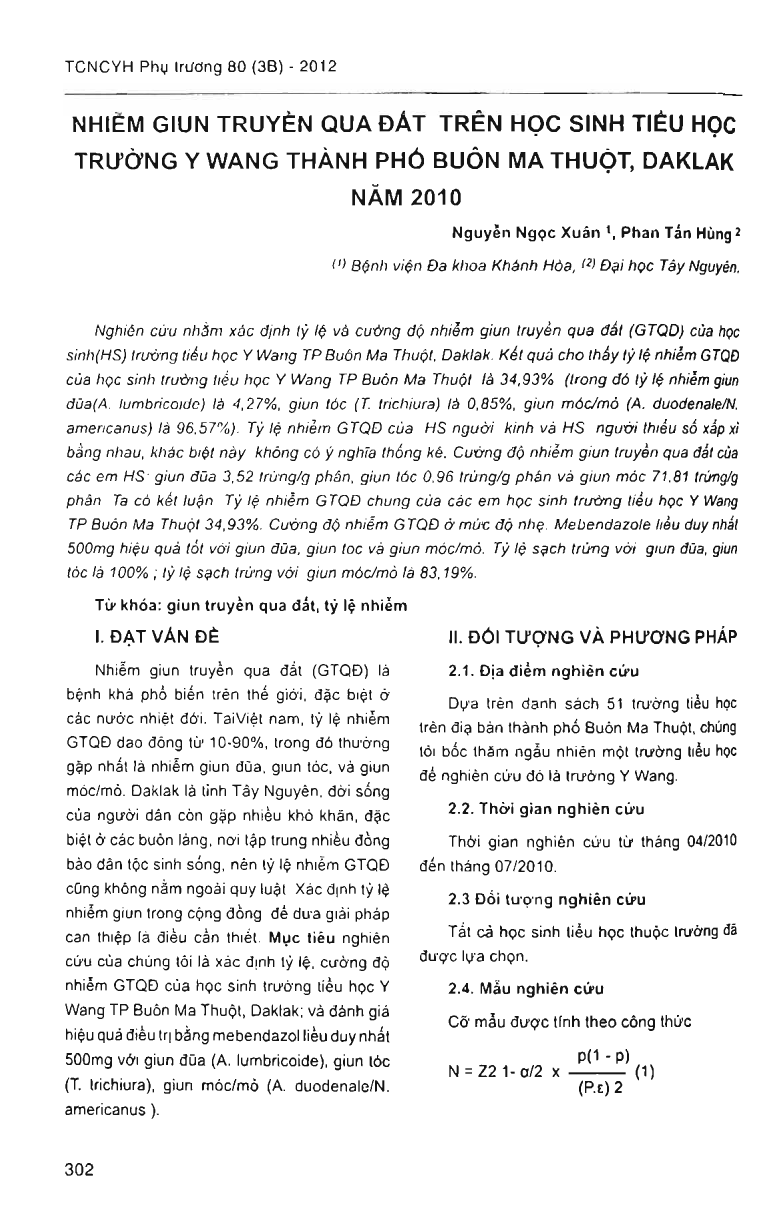 Nhiễm giun truyền qua đất trên học sinh tiểu học trường Y Wang thành phố Buôn Ma Thuột, Đắc Lắc