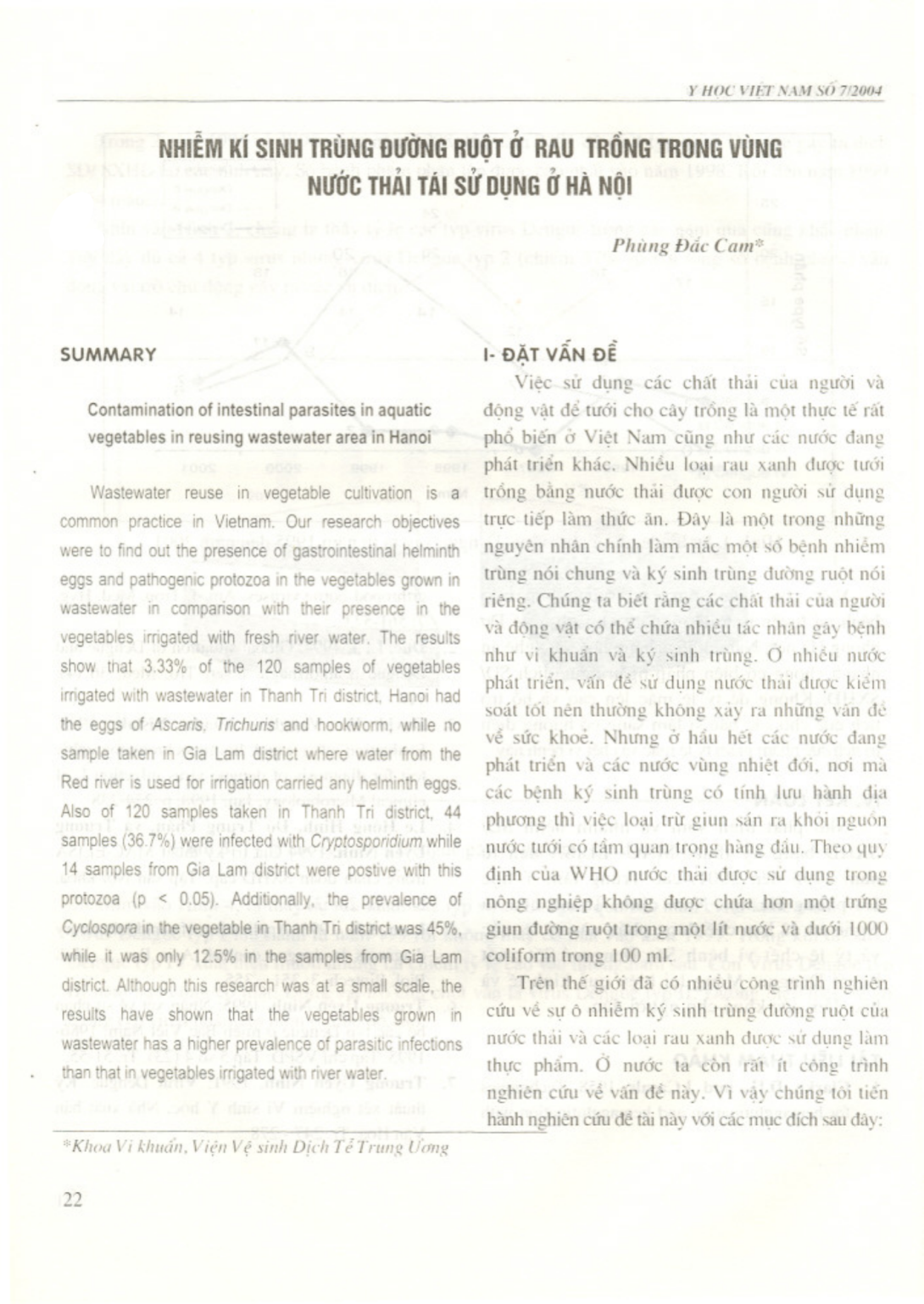 Nghiên cứu đánh giá tình hình nhiễm ký sinh trùng đường ruột của rau muống được trồng ở ngoại thành Hà Nội. Trình bày kết quả so sánh mức độ nhiễm ký sinh trùng đường ruột của rau muống được trồng bởi nước thải thành phố (huyện Thanh Trì) và rau muống được trồng bởi nước sông Hồng (huyện Gia Lâm)