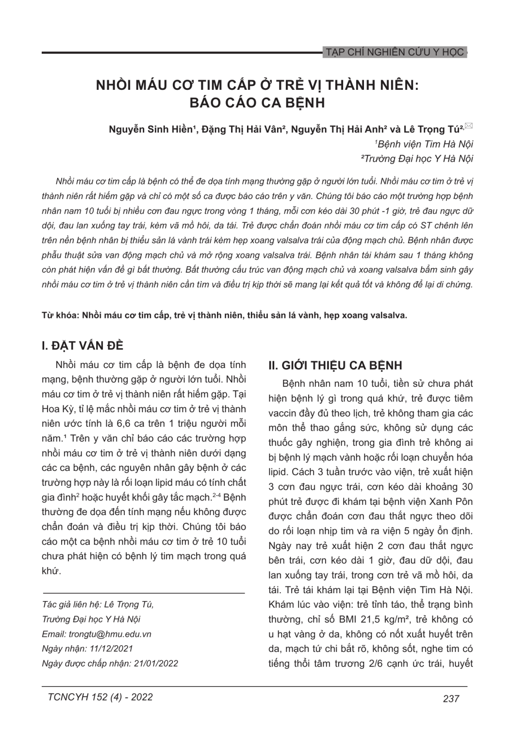 Nhồi máu cơ tim cấp là bệnh có thể đe dọa tính mạng thường gặp ở người lớn tuổi. Nhồi máu cơ tim ở trẻ vị thành niên rất hiếm gặp và chỉ có một số ca được báo cáo trên y văn. Chúng tôi báo cáo một trường hợp bệnh nhân nam 10 tuổi bị nhiều cơn đau ngực trong vòng 1 tháng, mỗi cơn kéo dài 30 phút -1 giờ, trẻ đau ngực dữ dội, đau lan xuống tay trái, kèm vã mồ hôi, da tái. Trẻ được chẩn đoán nhồi máu cơ tim cấp có ST chênh lên trên nền bệnh nhân bị thiểu sản lá vành trái kèm hẹp xoang valsalva trái của động mạch chủ. Bệnh nhân được phẫu thuật sửa van động mạch chủ và mở rộng xoang valsalva trái. Bệnh nhân tái khám sau 1 tháng không còn phát hiện vấn đề gì bất thường. Bất thường cấu trúc van động mạch chủ và xoang valsalva bẩm sinh gây nhồi máu cơ tim ở trẻ vị thành niên cần tìm và điều trị kịp thời sẽ mang lại kết quả tốt và không để lại di chứng