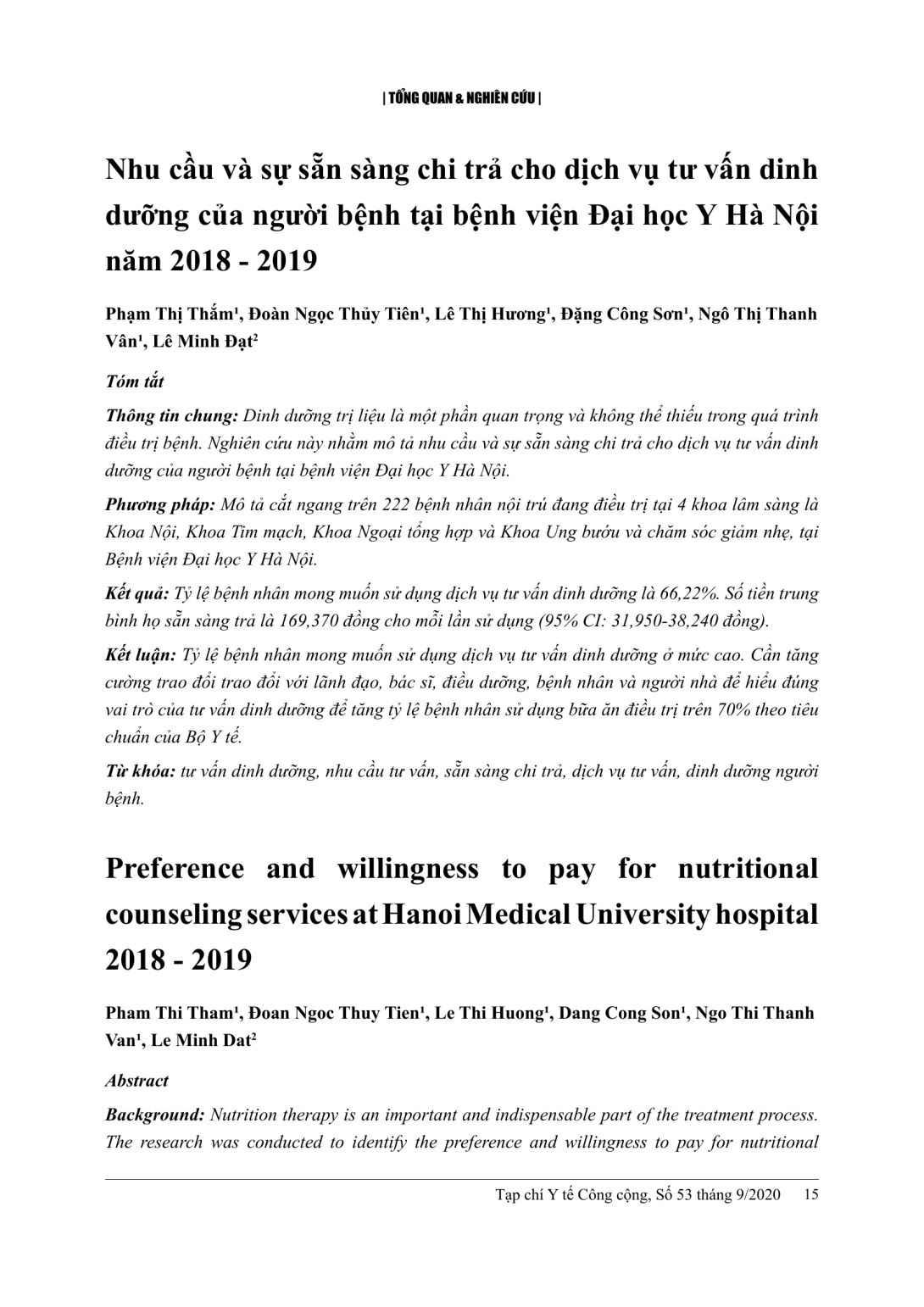Thông tin chung Dinh dưỡng trị liệu là một phần quan trọng và không thể thiếu trong quá trình điều trị bệnh. Nghiên cứu này nhằm mô tả nhu cầu và sự sẵn sàng chi trả cho dịch vụ tư vấn dinh dưỡng của người bệnh tại bệnh viện Đại học Y Hà Nội. Phương pháp Mô tả cắt ngang trên 222 bệnh nhân nội trú đang điều trị tại 4 khoa lâm sàng là Khoa Nội, Khoa Tim mạch, Khoa Ngoại tổng hợp và Khoa Ung bướu và chăm sóc giảm nhẹ, tại Bệnh viện Đại học Y Hà Nội. Kết quả Tỷ lệ bệnh nhân mong muốn sử dụng dịch vụ tư vấn dinh dưỡng là 66,22%. Số tiền trung bình họ sẵn sàng trả là 169,370 đồng cho mỗi lần sử dụng (95% CI 31,950-38,240 đồng). Kết luận Tỷ lệ bệnh nhân mong muốn sử dụng dịch vụ tư vấn dinh dưỡng ở mức cao. Cần tăng cường trao đổi trao đổi với lãnh đạo, bác sĩ, điều dưỡng, bệnh nhân và người nhà để hiểu đúng vai trò của tư vấn dinh dưỡng để tăng tỷ lệ bệnh nhân sử dụng bữa ăn điều trị trên 70% theo tiêu chuẩn của Bộ Y tế.