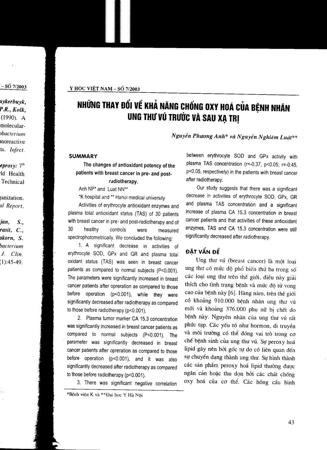 Những thay đổi về khả năng chống oxy hoá của bệnh nhân ung thư vú trước và sau xạ trị