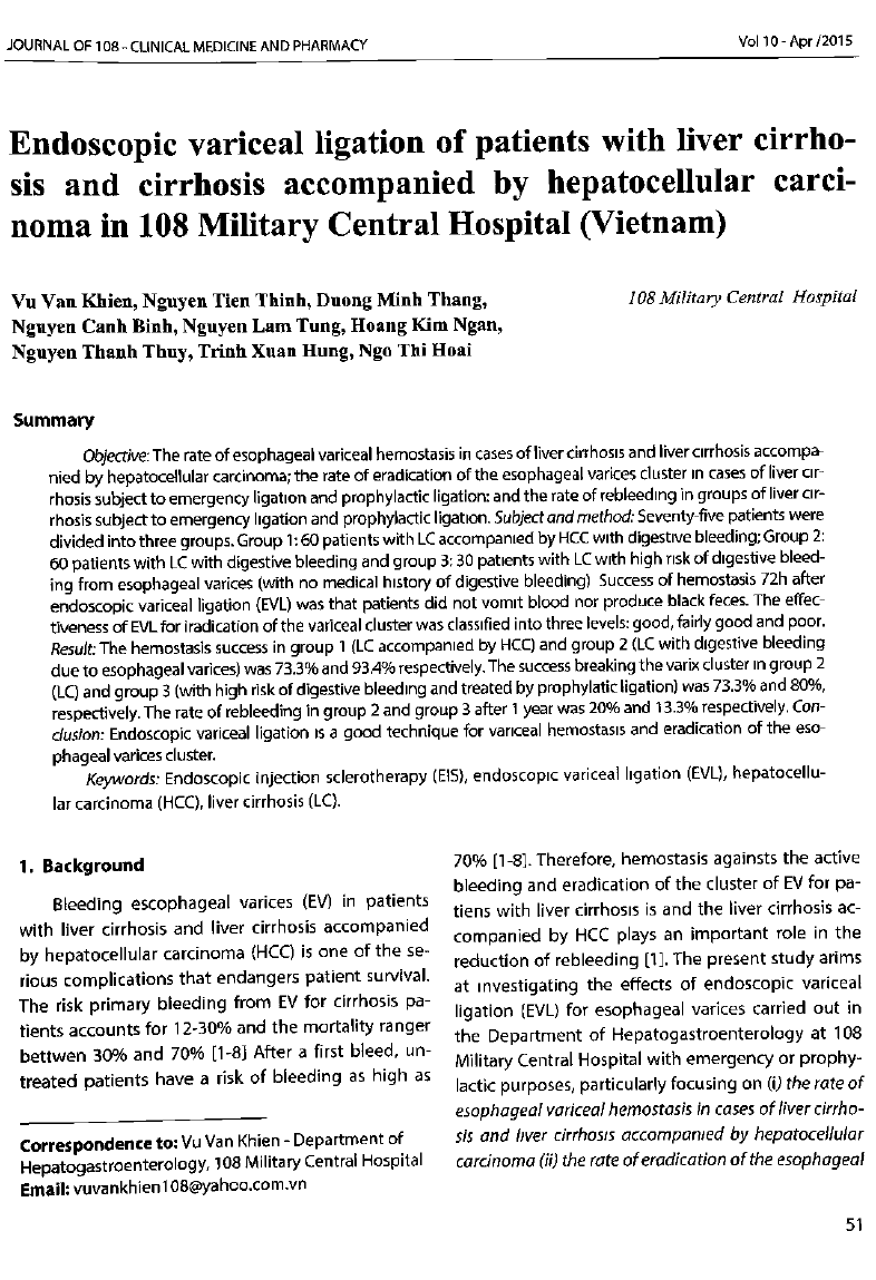 Objective: The rate of esophageal variceal hemostasis in cases of liver cirrhosis and liver cirrhosis accompa-nied by hepatocellular carcinoma; the rate of eradication of the esophageal varices cluster in cases of liver cir-rhosis subject to emergency ligation and prophylactic ligation: and the rate of re-bleeding in groups of liver cir-rhosis subject to emergency ligation and prophylactic ligation. Subject and method: Seventy-five patients were divided into three groups. Group 1: 60 patients with LC accompanied by HCC with digestive bleeding; Group 2: 60 patients with LC with digestive bleeding and group 3: 30 patients with LC with high risk of digestive bleeding from esophageal varices (with no medical history of digestive bleeding). Success of hemostasis 72h after endoscopic variceal ligation (EVL) was that patients did not vomit blood nor produce black feces. The effectiveness of EVL for iradication of the variceal cluster was classified into three levels: good, fairly good and poor. Result: The hemostasis success in group 1 (LC accompanied by HCC) and group 2 (LC with digestive bleeding due to esophageal varices) was 73.3 percent and 93.4 percent respectively. The success breaking the varix cluster in group 2 (LC) and group 3 (with high risk of digestive bleeding and treated by prophylatic ligation) was 73.3 percent and 80 percent, respectively. The rate of re-bleeding in group 2 and group 3 after 1 year was 20 percent and 13.3 percent respectively. Conclusion: Endoscopic variceal ligation is a good technique for variceal hemostasis and eradication of the esophageal varices cluster.