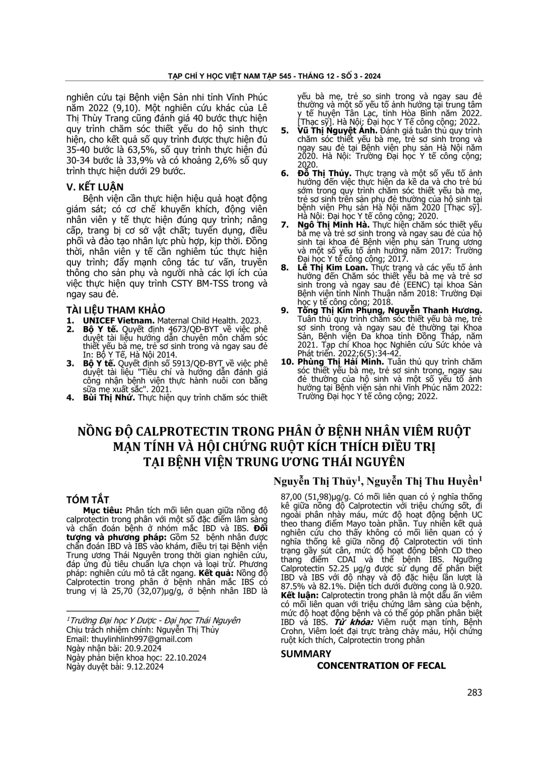 Phân tích mối liên quan giữa nồng độ calprotectin trong phân với một số đặc điểm lâm sàng và chẩn đoán bệnh ở nhóm mắc IBD và IBS. Đối tượng và phương pháp: Gồm 52 bệnh nhân được chẩn đoán IBD và IBS vào khám, điều trị tại Bệnh viện Trung ương Thái Nguyên trong thời gian nghiên cứu, đáp ứng đủ tiêu chuẩn lựa chọn và loại trừ. Phương pháp: nghiên cứu mô tả cắt ngang. Kết quả: Nồng độ Calprotectin trong phân ở bệnh nhân mắc IBS có trung vị là 25,70 (32,07)μg/g, ở bệnh nhân IBD là 87,00 (51,98)μg/g. Có mối liên quan có ý nghĩa thống kê giữa nồng độ Calprotectin với triệu chứng sốt, đi ngoài phân nhày máu, mức độ hoạt động bệnh UC theo thang điểm Mayo toàn phần. Tuy nhiên kết quả nghiên cứu cho thấy không có mối liên quan có ý nghĩa thống kê giữa nồng độ Calprotectin với tình trạng gầy sút cân, mức độ hoạt động bệnh CD theo thang điểm CDAI và thể bệnh IBS. Ngưỡng Calprotectin 52.25 μg/g được sử dụng để phân biệt IBD và IBS với độ nhạy và độ đặc hiệu lần lượt là 87.5% và 82.1%. Diện tích dưới đường cong là 0.920. Kết luận: Calprotectin trong phân là một dấu ấn viêm có mối liên quan với triệu chứng lâm sàng của bệnh, mức độ hoạt động bệnh và có thể góp phần phân biệt IBD và IBS.