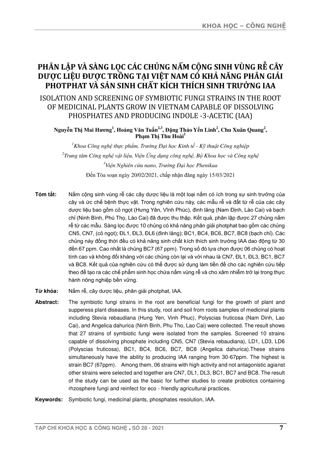 Nấm cộng sinh vùng rễ các cây dược liệu là một loại nấm có ích trong sự sinh trưởng của cây và ức chế bệnh thực vật. Trong nghiên cứu này, các mẫu rễ và đất từ rễ của các cây dược liệu bao gồm cỏ ngọt (Hưng Yên, Vĩnh Phúc), đinh lăng (Nam Định, Lào Cai) và bạch chỉ (Ninh Bình, Phú Thọ, Lào Cai) đã được thu thập. Kết quả, phân lập được 27 chủng nấm rễ từ các mẫu. Sàng lọc được 10 chủng có khả năng phân giải photphat bao gồm các chủng CN5, CN7, (cỏ ngọt); ĐL1, ĐL3, ĐL6 (đinh lăng); BC1, BC4, BC6, BC7, BC8 (bạch chỉ). Các chủng này đồng thời đều có khả năng sinh chất kích thích sinh trưởng IAA dao động từ 30 đến 67 ppm. Cao nhất là chủng BC7 (67 ppm). Trong số đó lựa chọn được 06 chủng có hoạt tính cao và không đối kháng với các chủng còn lại và với nhau là CN7, ĐL1, ĐL3, BC1, BC7 và BC8. Kết quả của nghiên cứu có thể được sử dụng làm tiền đề cho các nghiên cứu tiếp theo để tạo ra các chế phẩm sinh học chứa nấm vùng rễ và cho xâm nhiễm trở lại trong thực hành nông nghiệp bền vững.