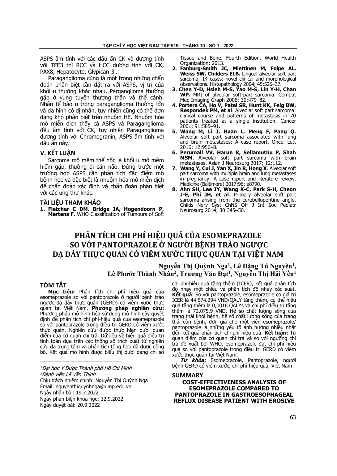 Phân tích chi phí hiệu quả của esomeprazole so với pantoprazole ở người bệnh trào ngược dạ dày thực quản (GERD) có viêm xước thực quản tại Việt Nam. Phương pháp nghiên cứu: Phương pháp mô hình hóa sử dụng mô hình cây quyết định để phân tích chi phí-hiệu quả của esomeprazole so với pantoprazole trong điều trị GERD có viêm xước thực quản. Nghiên cứu được thực hiện dưới quan điểm của cơ quan chi trả. Dữ liệu về hiệu quả điều trị tính toán dựa trên các thông số trích xuất từ nghiên cứu đa trung tâm và phân tích tổng hợp đã được công bố. Kết quả mô hình được biểu thị dưới dạng chỉ số chi phí-hiệu quả tăng thêm (ICER), kết quả phân tích độ nhạy một chiều và phân tích độ nhạy xác suất. So với pantoprazole, esomeprazole có giá trị ICER là 44.574.294 VND/QALY tăng thêm, cụ thể hiệu quả tăng thêm là 0,0016 QALYs và chi phí điều trị tăng thêm là 72.075,9 VND. Hệ số chất lượng sống của trạng thái khỏi bệnh, hệ số chất lượng sống của trạng thái còn bệnh, đơn giá cho một viên esomeprazole/ pantoprazole là những yếu tố ảnh hưởng nhiều nhất đến kết quả phân tích chi phí hiệu quả. Kết luận: Từ quan điểm của cơ quan chi trả và so với ngưỡng chi trả đề xuất bởi WHO, esomeprazole đạt chi phí hiệu quả so với pantoprazole trong điều trị GERD có viêm xước thực quản tại Việt Nam.