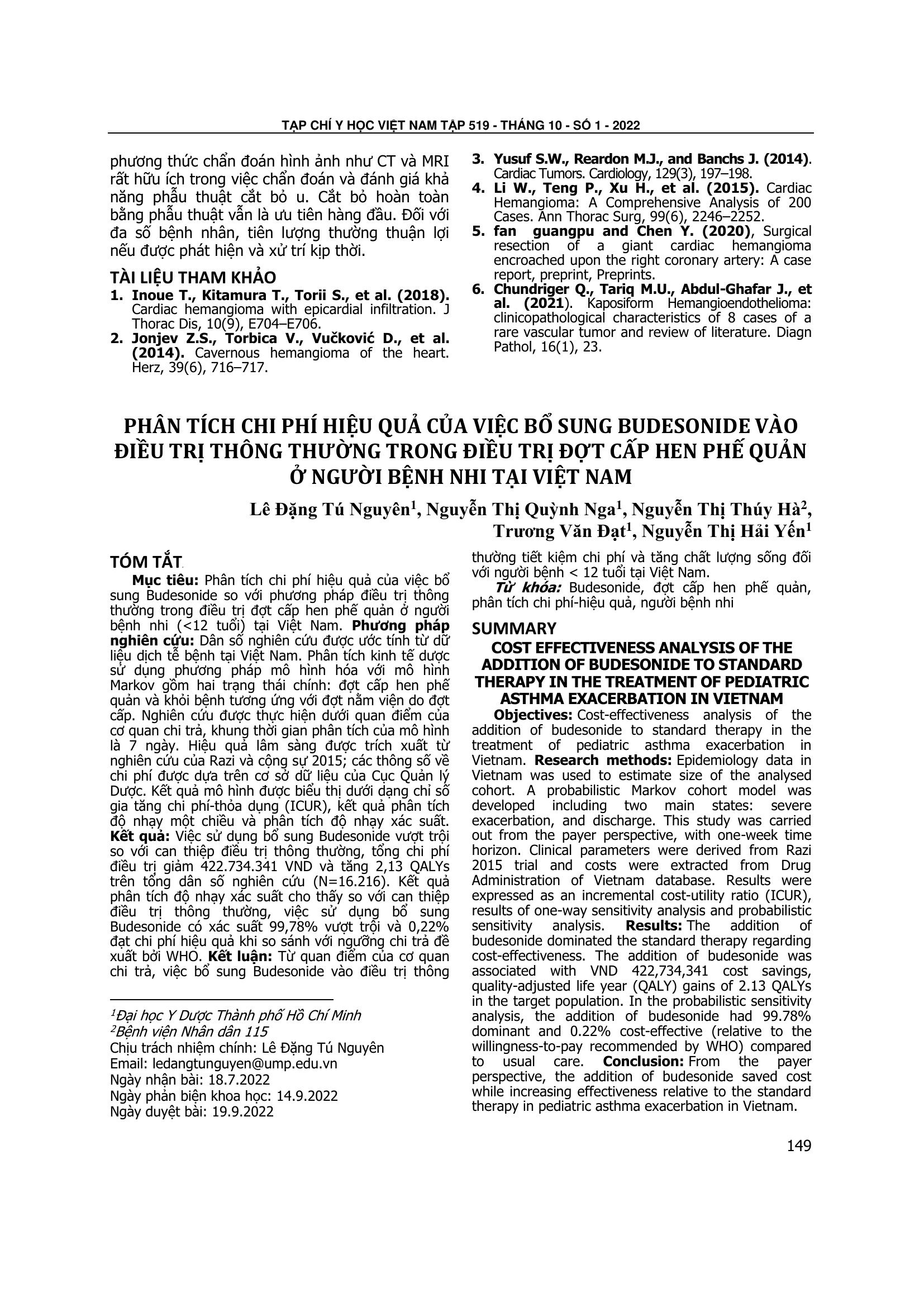 Phân tích chi phí hiệu quả của việc bổ sung Budesonide so với phương pháp điều trị thông thường trong điều trị đợt cấp hen phế quản ở người bệnh nhi (<12 tuổi) tại Việt Nam. Phương pháp nghiên cứu: Dân số nghiên cứu được ước tính từ dữ liệu dịch tễ bệnh tại Việt Nam. Phân tích kinh tế dược sử dụng phương pháp mô hình hóa với mô hình Markov gồm hai trạng thái chính: đợt cấp hen phế quản và khỏi bệnh tương ứng với đợt nằm viện do đợt cấp. Nghiên cứu được thực hiện dưới quan điểm của cơ quan chi trả, khung thời gian phân tích của mô hình là 7 ngày. Hiệu quả lâm sàng được trích xuất từ nghiên cứu của Razi và cộng sự 2015; các thông số về chi phí được dựa trên cơ sở dữ liệu của Cục Quản lý Dược. Kết quả mô hình được biểu thị dưới dạng chỉ số gia tăng chi phí-thỏa dụng (ICUR), kết quả phân tích độ nhạy một chiều và phân tích độ nhạy xác suất. Kết quả: Việc sử dụng bổ sung Budesonide vượt trội so với can thiệp điều trị thông thường, tổng chi phí điều trị giảm 422.734.341 VND và tăng 2,13 QALYs trên tổng dân số nghiên cứu (N=16.216). Kết quả phân tích độ nhạy xác suất cho thấy so với can thiệp điều trị thông thường, việc sử dụng bổ sung Budesonide có xác suất 99,78% vượt trội và 0,22% đạt chi phí hiệu quả khi so sánh với ngưỡng chi trả đề xuất bởi WHO. Kết luận: Từ quan điểm của cơ quan chi trả, việc bổ sung Budesonide vào điều trị thông hường tiết kiệm chi phí và tăng chất lượng sống đối với người bệnh < 12 tuổi tại Việt Nam.