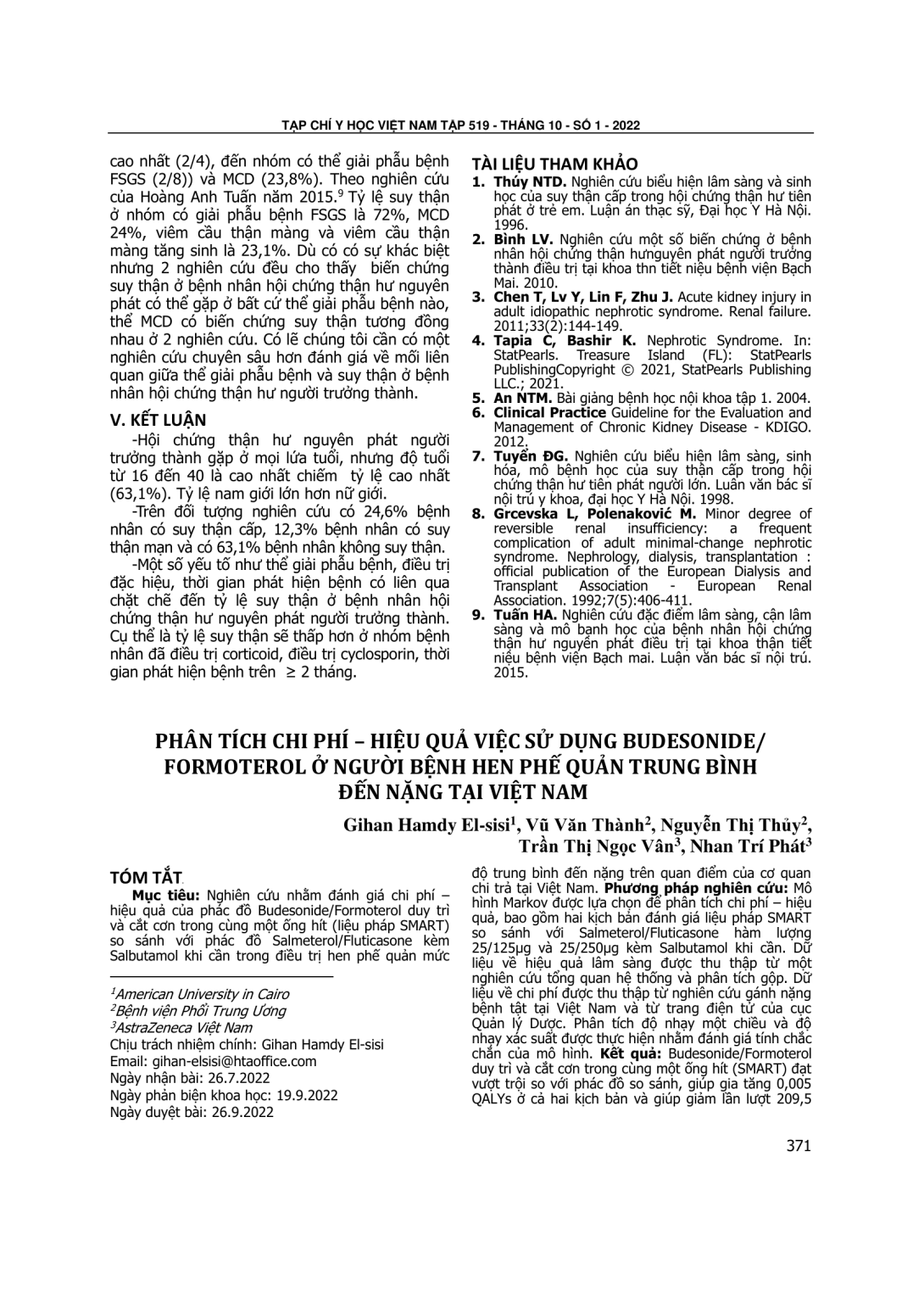 Nghiên cứu nhằm đánh giá chi phí – hiệu quả của phác đồ Budesonide/Formoterol duy trì và cắt cơn trong cùng một ống hít (liệu pháp SMART) so sánh với phác đồ Salmeterol/Fluticasone kèm Salbutamol khi cần trong điều trị hen phế quản mức độ trung bình đến nặng trên quan điểm của cơ quan chi trả tại Việt Nam. Phương pháp nghiên cứu: Mô hình Markov được lựa chọn để phân tích chi phí – hiệu quả, bao gồm hai kịch bản đánh giá liệu pháp SMART so sánh với Salmeterol/Fluticasone hàm lượng 25/125µg và 25/250µg kèm Salbutamol khi cần. Dữ liệu về hiệu quả lâm sàng được thu thập từ một nghiên cứu tổng quan hệ thống và phân tích gộp. Dữ liệu về chi phí được thu thập từ nghiên cứu gánh nặng bệnh tật tại Việt Nam và từ trang điện tử của cục Quản lý Dược. Phân tích độ nhạy một chiều và độ nhạy xác suất được thực hiện nhằm đánh giá tính chắc chắn của mô hình. Kết quả: Budesonide/Formoterol duy trì và cắt cơn trong cùng một ống hít (SMART) đạt vượt trội so với phác đồ so sánh, giúp gia tăng 0,005 QALYs ở cả hai kịch bản và giúp giảm lần lượt 209,5 và 181,7 triệu đồng chi phí điều trị ở các kịch bản một và hai. Phân tích độ nhạy một chiều và độ nhạy xác suất đều khẳng định trong đa số trường hợp, Budesonide/Formoterol đều đạt chi phí – hiệu quả. Ở người bệnh hen phế quản mức độ trung bình đến nặng, liệu pháp SMART đem lại hiệu quả cao hơn trong khi chi phí điều trị thấp hơn so với phác đồ so sánh. Kết quả này cung cấp bằng chứng về tính kinh tế y tế giúp các nhà hoạch định chính sách có thêm thông tin trong việc ra quyết định lựa chọn liệu pháp quản lý bệnh hen phế quản mức độ trung bình đến nặng tại Việt Nam.