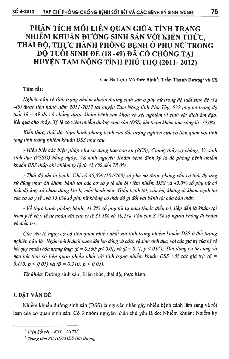 The study was conducted in July of 2011 in Tam Hong district, Phu Tho province. A total of 532 married women at the age of child bearing 18 - 49 were gynecologically examinated and the samples of their vaginal discharge were taken to identify parasites. The results showed that the rate of reproductive tract infection (with syndrome) was clinically 79.0 percent. The rate of reproductive tract infections in relation to the knowledge, attitudes and practices of the study subject was as follows: Knowledge: The women had a little knowledge about the measures such as condom use, monogamy, personal daily hygiene, menstrual hygiene, periodic health checkup for disease prevention, which generally accountedfor a low rate of 45.6 percent to 78.0 percent. Attitude: The women had a low attitude when they got the disease. Only 45.0 percent (104/260) of the interviewed women had a right behavior, such as going to the doctor for examination and treatment and 43.0 percent of the women had an improper behavior when they got infected such as hiding disease, feeling ashamed, and not seeking for medical examination and treatment at health facilities ... and 13.0 percent did not have any attitudes towards their disease. Practices: 41.2 percent of the infected women did their self-treatment, 31.1 percent had examination at communal health stations, 10.2 percent went to private clinics, and 8.7 percent didn!t look for any medical examination and treatment. The risk factors which were the most associated with bacterial infection of the study subjects reproductive system were: working in the water and poor reproductive tract hygiene with the corresponding value of standardized regression coefficients (Beta = 0.360, p 0.01) and (Beta