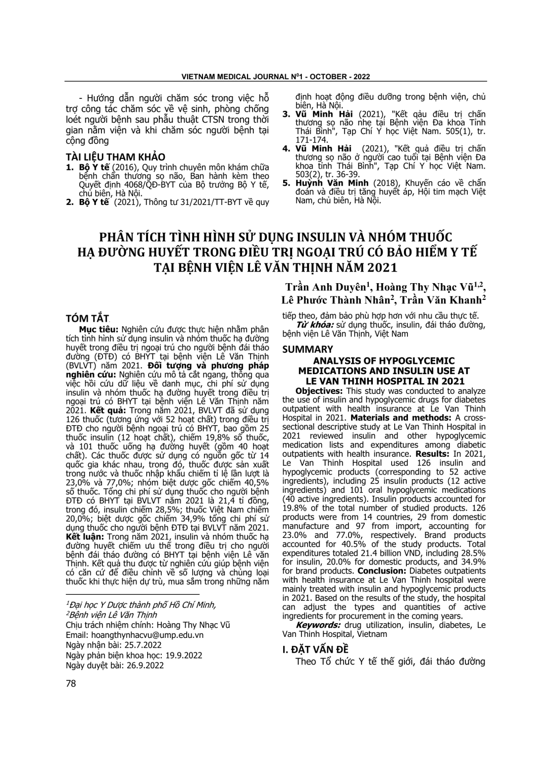 Nghiên cứu được thực hiện nhằm phân tích tình hình sử dụng insulin và nhóm thuốc hạ đường huyết trong điều trị ngoại trú cho người bệnh đái tháo đường (ĐTĐ) có BHYT tại bệnh viện Lê Văn Thịnh (BVLVT) năm 2021. Đối tượng và phương pháp nghiên cứu: Nghiên cứu mô tả cắt ngang, thông qua việc hồi cứu dữ liệu về danh mục, chi phí sử dụng insulin và nhóm thuốc hạ đường huyết trong điều trị ngoại trú có BHYT tại bệnh viện Lê Văn Thịnh năm 2021. Kết quả: Trong năm 2021, BVLVT đã sử dụng 126 thuốc (tương ứng với 52 hoạt chất) trong điều trị ĐTĐ cho người bệnh ngoại trú có BHYT, bao gồm 25 thuốc insulin (12 hoạt chất), chiếm 19,8% số thuốc, và 101 thuốc uống hạ đường huyết (gồm 40 hoạt chất). Các thuốc được sử dụng có nguồn gốc từ 14 quốc gia khác nhau, trong đó, thuốc được sản xuất trong nước và thuốc nhập khẩu chiếm tỉ lệ lần lượt là 23,0% và 77,0%; nhóm biệt dược gốc chiếm 40,5% số thuốc. Tổng chi phí sử dụng thuốc cho người bệnh ĐTĐ có BHYT tại BVLVT năm 2021 là 21,4 tỉ đồng, trong đó, insulin chiếm 28,5%; thuốc Việt Nam chiếm 20,0%; biệt dược gốc chiếm 34,9% tổng chi phí sử dụng thuốc cho người bệnh ĐTĐ tại BVLVT năm 2021.Trong năm 2021, insulin và nhóm thuốc hạ đường huyết chiếm ưu thế trong điều trị cho người bệnh đái tháo đường có BHYT tại bệnh viện Lê văn Thịnh. Kết quả thu được từ nghiên cứu giúp bệnh viện có căn cứ để điều chỉnh về số lượng và chủng loại thuốc khi thực hiện dự trù, mua sắm trong những năm tiếp theo, đảm bảo phù hợp hơn với nhu cầu thực tế.