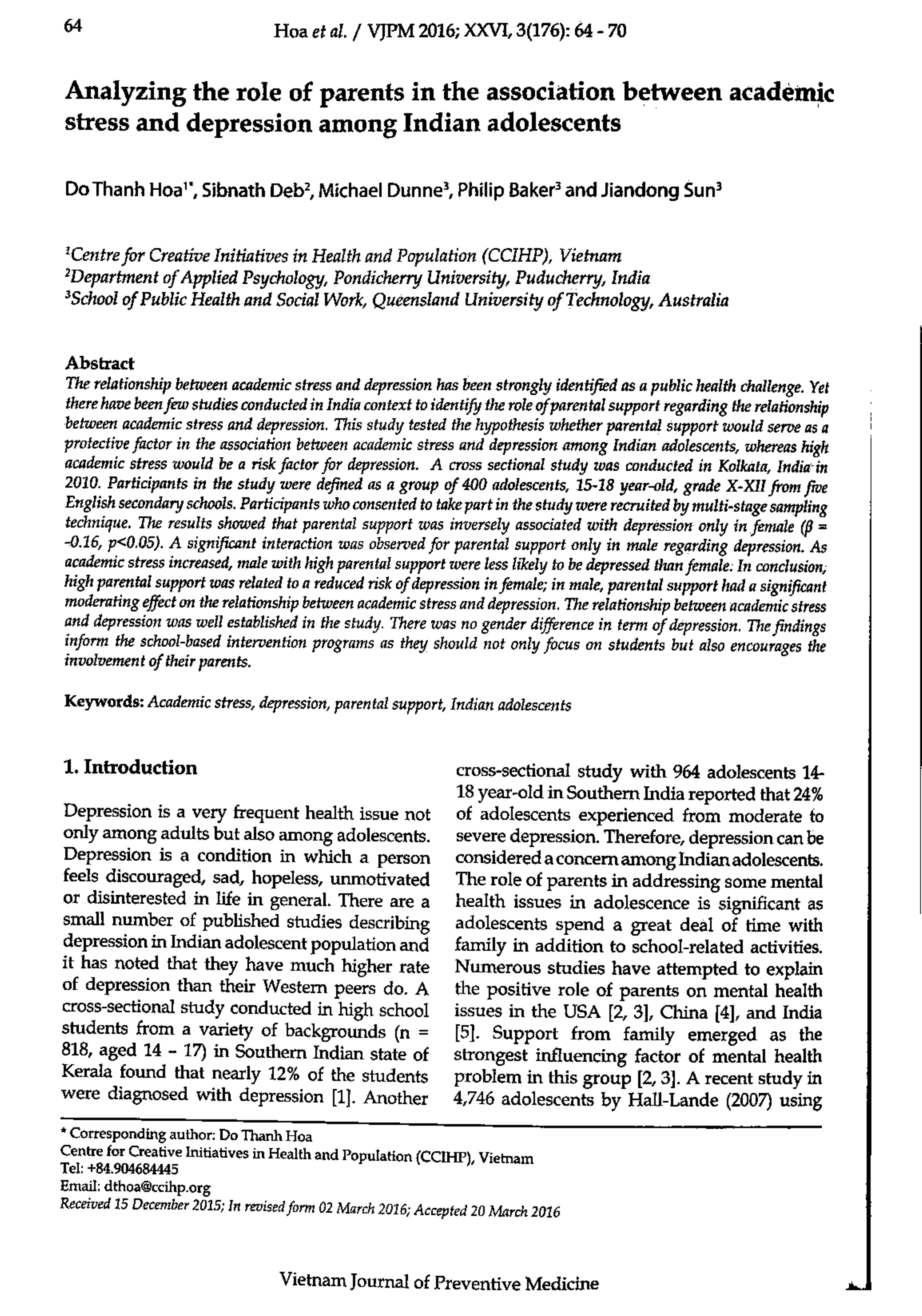 Phân tích vai trò của cha mẹ trong mối quan hệ giữa sự căng thẳng học tập và sự trầm cảm trong thanh thiếu niên ấn Độ
