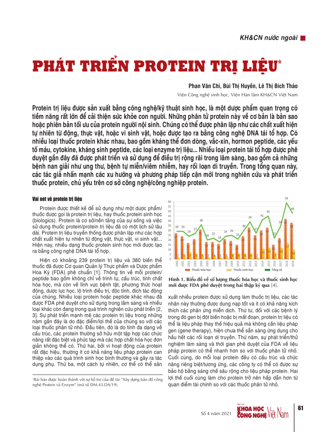 Protein trị liệu được sản xuất bằng công nghệ/kỹ thuật sinh học, là một dược phẩm quan trọng có tiềm năng rất lớn để cải thiện sức khỏe con người. Những phân tử protein này về cơ bản là bản sao hoặc phiên bản tối ưu của protein người nội sinh. Chúng có thể được phân lập như các chất xuất hiện tự nhiên từ động, thực vật, hoặc vi sinh vật, hoặc được tạo ra bằng công nghệ DNA tái tổ hợp. Có nhiều loại thuốc protein khác nhau, bao gồm kháng thể đơn dòng, vắc-xin, hormon peptide, các yếu tố máu, cytokine, kháng sinh peptide, các loại enzyme trị liệu... Nhiều loại protein tái tổ hợp được phê duyệt gần đây đã được phát triển và sử dụng để điều trị rộng rãi trong lâm sàng, bao gồm cả những bệnh nan giải như ung thư, bệnh tự miễn/viêm nhiễm, hay rối loạn di truyền. Trong tổng quan này, các tác giả nhấn mạnh các xu hướng và phương pháp tiếp cận mới trong nghiên cứu và phát triển thuốc protein, chủ yếu trên cơ sở công nghệ/công nghiệp protein.