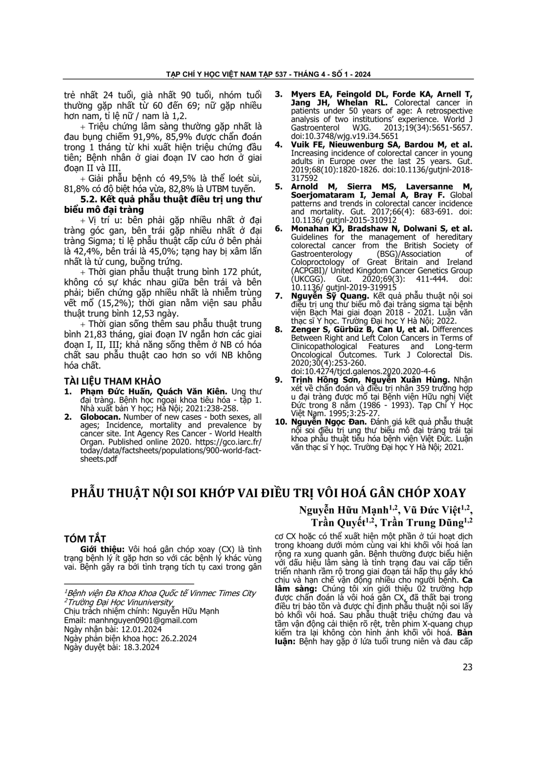 Chúng tôi xin giới thiệu 02 trường hợp được chẩn đoán là vôi hoá gân CX, đã thất bại trong điều trị bảo tồn và được chỉ định phẫu thuật nội soi lấy bỏ khối vôi hoá. Sau phẫu thuật triệu chứng đau và tầm vận động cải thiện rõ rệt, trên phim X-quang chụp kiểm tra lại không còn hình ảnh khối vôi hoá. Bàn luận: Bệnh hay gặp ở lứa tuổi trung niên và đau cấp vùng vai là triệu chứng nổi bật của bệnh. Điều trị chính của bệnh là bảo tồn bao gồm nghỉ ngơi, vật lý trị liệu và dùng NSAID. Phẫu thuật nội soi được đặt ra khi khối vôi hoá gây đau mãn tính không cải thiện bằng các phương pháp điều trị khác.Việc xác định chính xác vị trí khối vôi hoá trên nội soi và lấy bỏ tối đa khối vôi hoá là rất cần thiết trong phẫu thuật. Kết luận: Phẫu thuật nội soi là phương pháp ít xâm lấn giúp lấy được toàn bộ khối vôi hoá, bệnh nhân (BN) sau phẫu thuật cải thiện triệu chứng lâm sàng và phục hồi tầm vận động nhanh và rõ rệt. Phim chụp cộng hưởng từ rất cần thiết trong việc xác hình thái và vị trí khối vôi hoá.