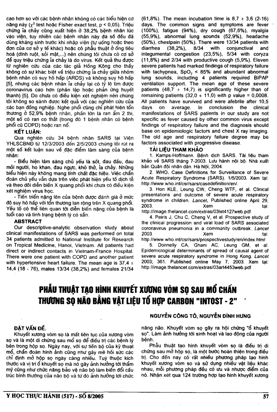 Nghiên cứu hồi cứu trên 124 trường hợp được mổ tại Khoa Phẫu thuật thần kinh, BV Xanh Poon - Hà Nội, nhóm nghiên cứu cho rặng cần thiết phải mổ tạo hình sọ khuyết để hoàn thiện quá trình điều trị chấn thương sọ não. Vật liệu tổ hợp carbon đã được chon cho việc tạo hình vòm sọ.. Vật liệu này được SX ngay tại Việt nam